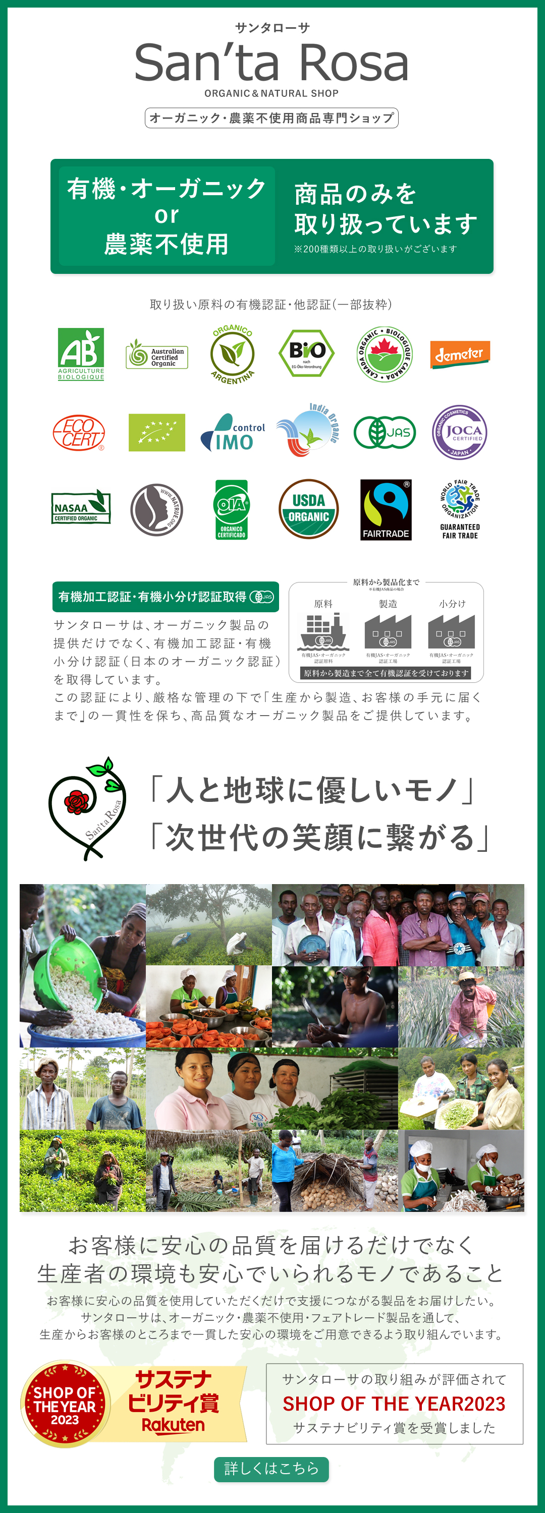 サンタローサは、有機 有機JAS認証 オーガニック オーガニックとは USDAオーガニック 海外オーガニック 海外オーガニック認証 農薬不使用 自然栽培 無添加 無漂白 無着料 無香料 化学肥料不使用 肥料不使用 安心 安全 高品質 最高級 本物 こだわり グルメ グルメ大賞 高級 意識高い系 サステナビリティ サスティナビリティ サスティナブル オーガニック店 オーガニック店舗 オーガニック専門店 有機加工 有機加工業者 有機小分け 有機小分け業者 有機輸入 契約農家 OEM 卸 卸販売 人に優しい 地球に優しい 体に優しい 楽天ショップオブザイヤー ショップオブザイヤー をお求めの方におすすめです。