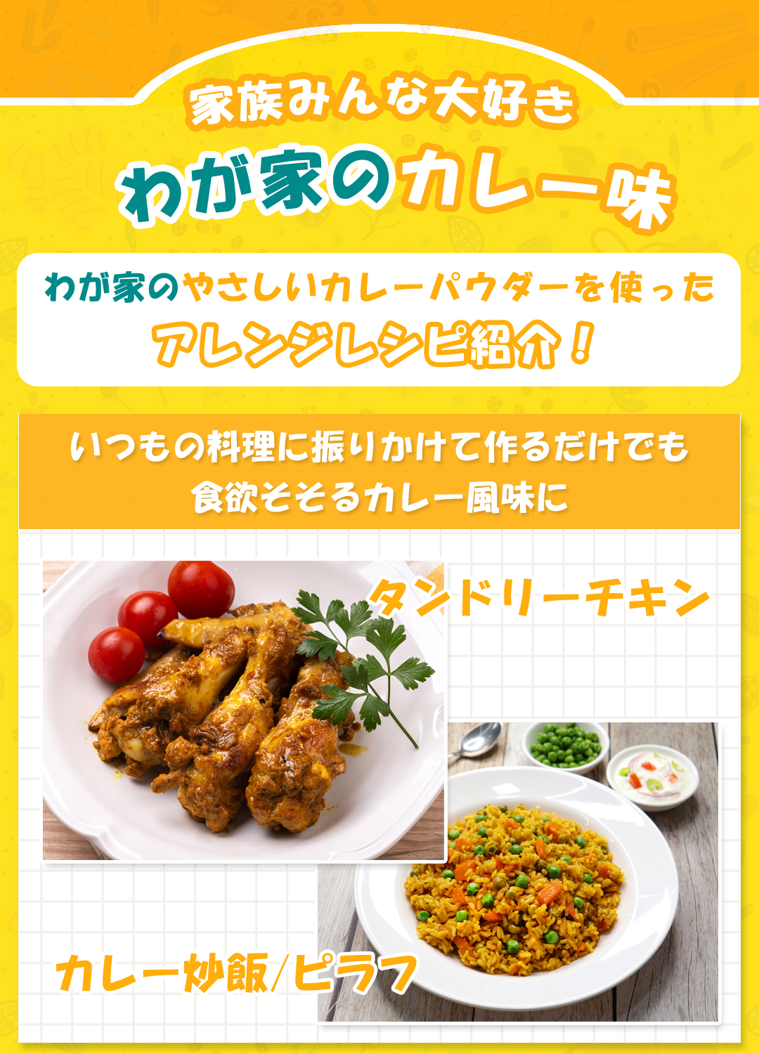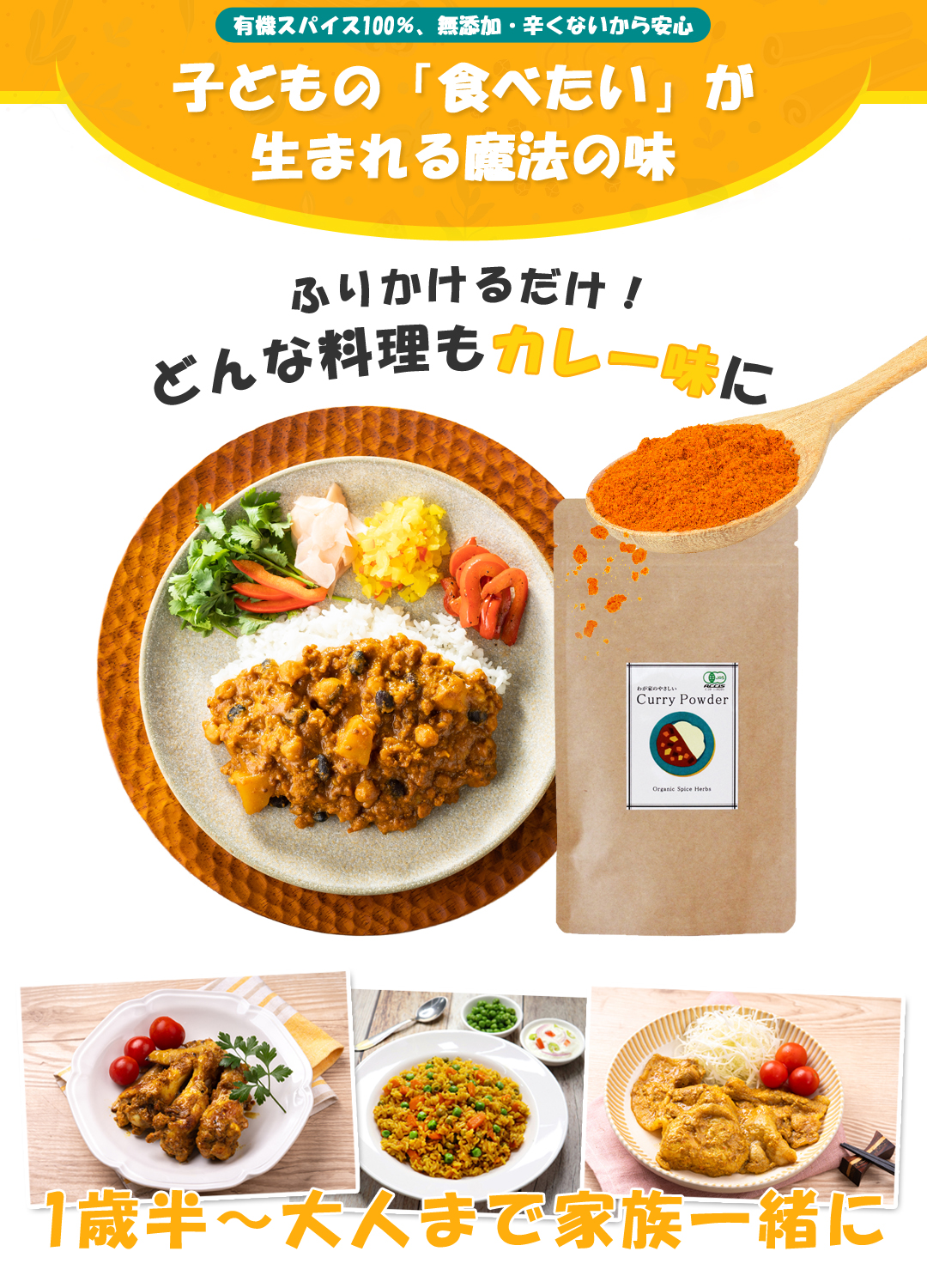 ふりかけるだけで、いつものごはんがカレー味に早変わり。おにぎり、炒め物、うどん、ポテトなど、子どもの“食べたい”を自然に引き出します。