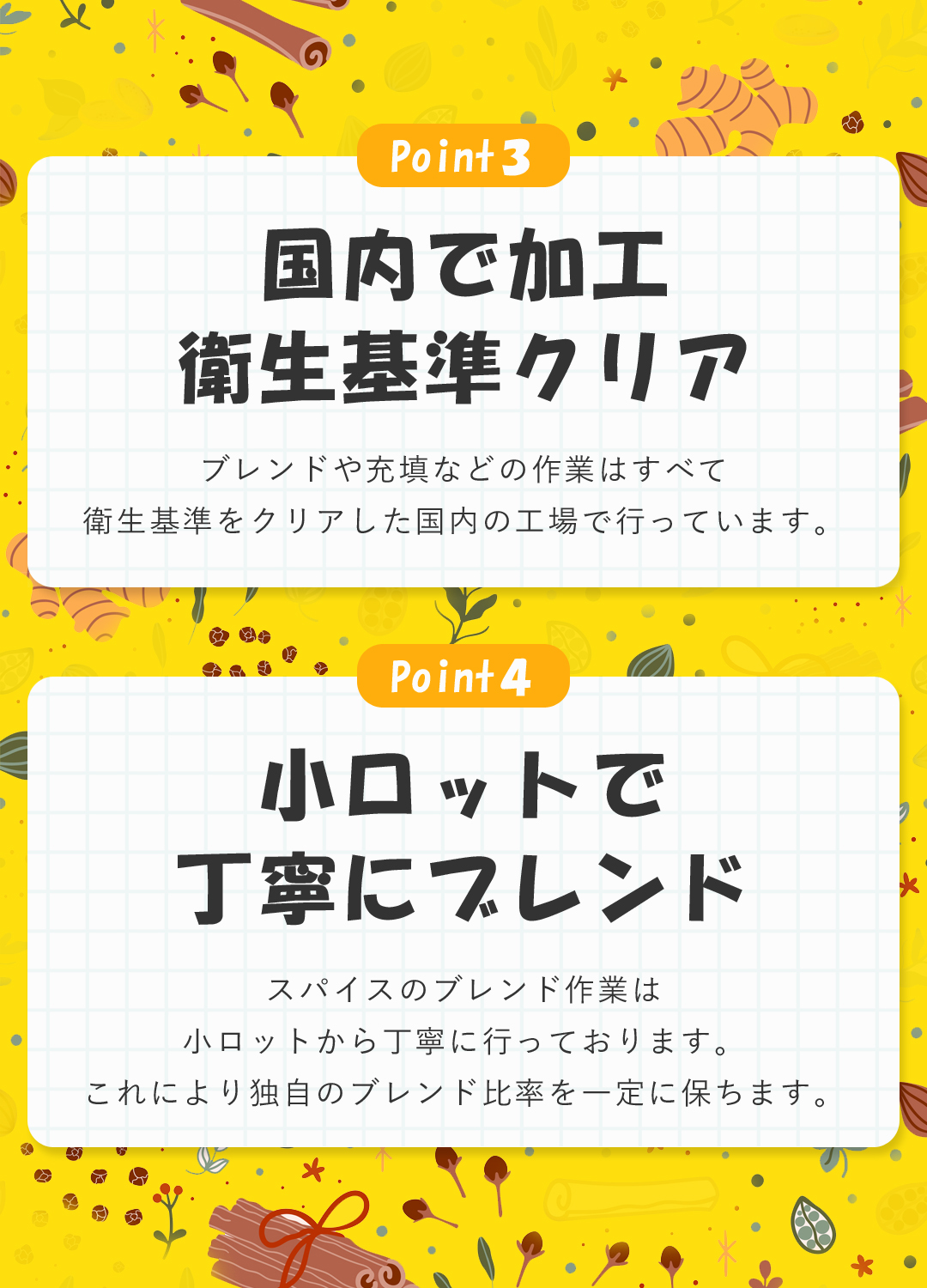 ■原材料:有機コリアンダーパウダー、有機クミンパウダー、有機パプリカパウダー、有機ターメリックパウダー