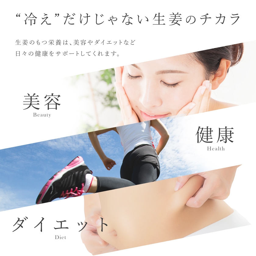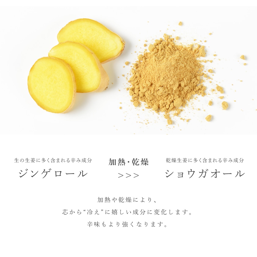 近年、乾燥させた生姜パウダーは身体を芯から温めることで美容・健康において大注目されています。生の生姜は体が温まるように思いますが、実際はコアの熱を指先に送って温めているため、体が冷えていきます。乾燥させると一部の成分が変化し、コアを温めながら指先まで温まっていくので、冷えでお悩みの方には生姜パウダーがおすすめとされています。