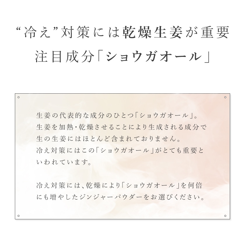 近年、乾燥させた生姜パウダーは身体を芯から温めることで美容・健康において大注目されています。生の生姜は体が温まるように思いますが、実際はコアの熱を指先に送って温めているため、体が冷えていきます。乾燥させると一部の成分が変化し、コアを温めながら指先まで温まっていくので、冷えでお悩みの方には生姜パウダーがおすすめとされています。