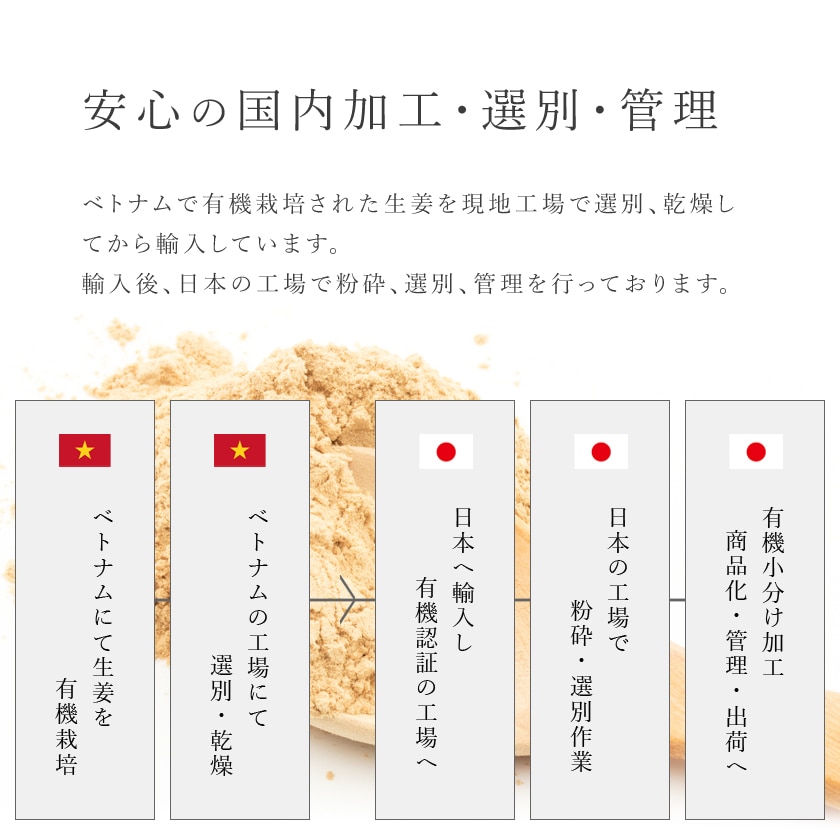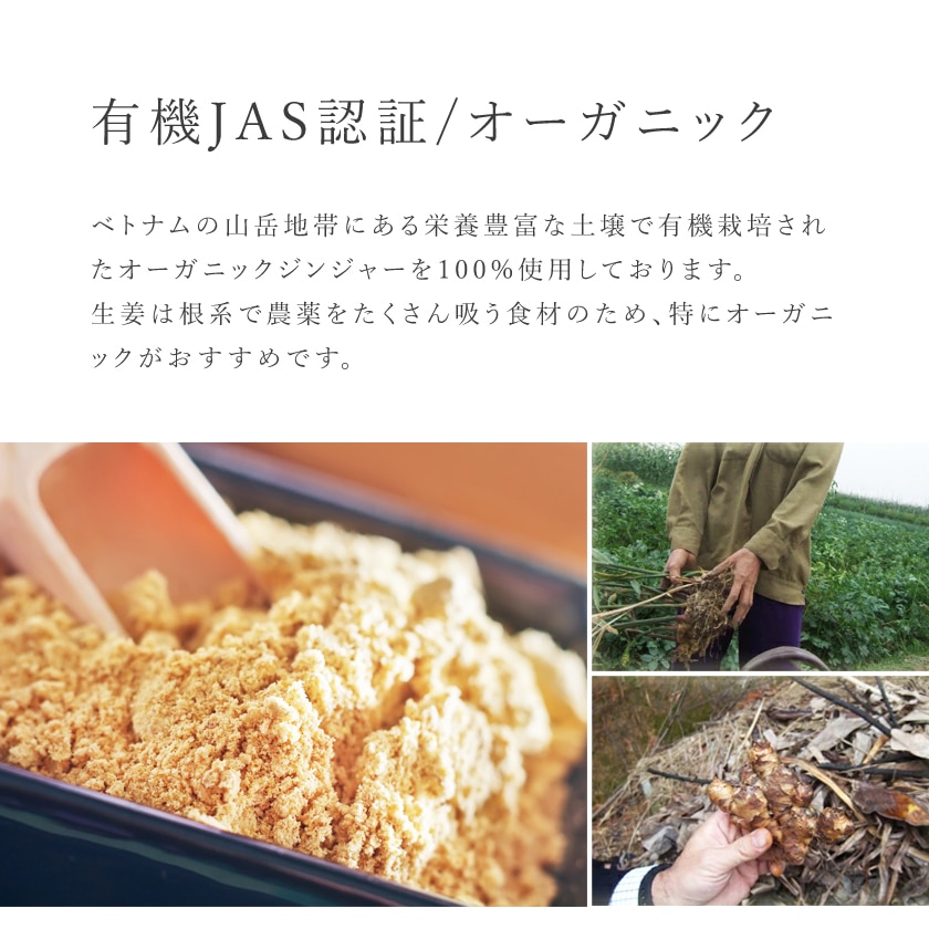 この生姜パウダーは、ベトナム山岳地帯の自然豊かな環境で安心安全にこだわりオーガニック栽培された有機生姜パウダーを100%使用しております。高品質の生姜を使用しているため、香り良く、しっかりとした辛みと雑味のない味わいが人気です。