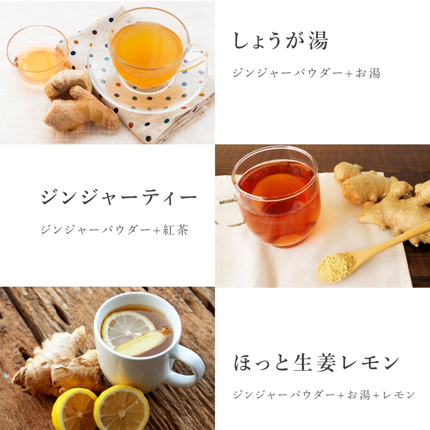豚の生姜焼き、 クラフトジンジャーエール、 生姜パウダー入り炒め物、 生姜パウダーの炊き込みご飯、 生姜パウダーのパンケーキ、 生姜パウダーのローストポテト、 生姜パウダー入り肉団子、 生姜パウダーの煮込み料理