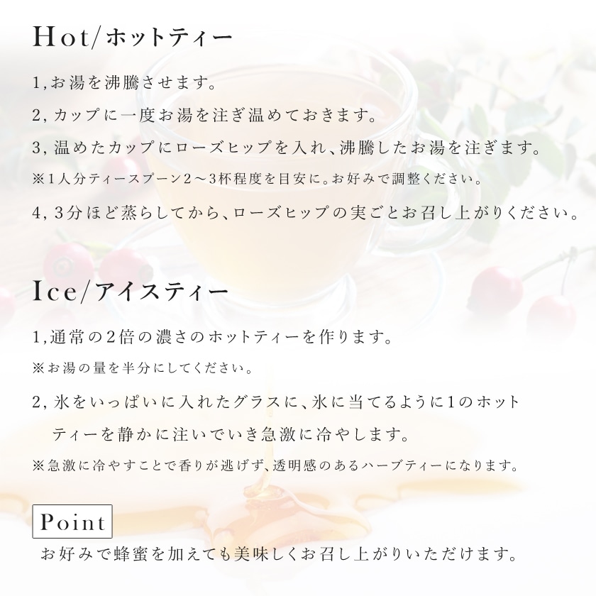 抽出しやすく、そのまま食べやすいように細かく砕いたファインカットタイプのローズヒップ。便利で栄養がたっぷり摂れる、日々の美容と健康をサポートするローズヒップティーをどうぞ。
