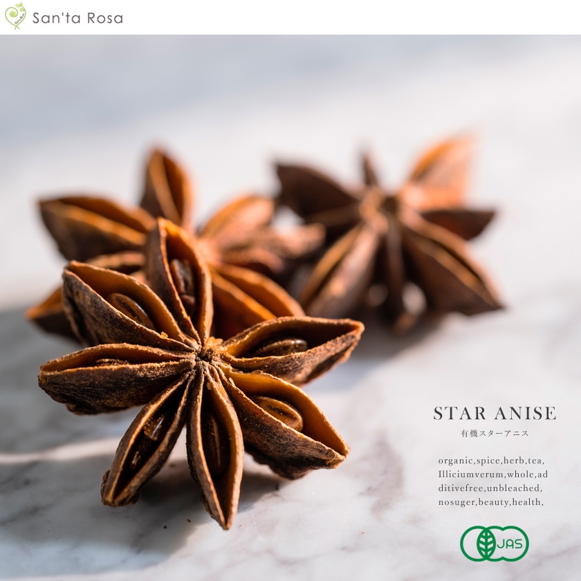 こちらはベトナム産の高品質なオーガニック「スターアニス」を100%使用です。少数民族の村々で丁寧に育てられ、秋に完熟した状態で収穫された最高級のスターアニスは、少量でも豊かな香りが広がるため、少量で十分な香味を楽しめるのが特徴です。スターアニスの使用には無駄がなく、高い香りと質を求める方に特におすすめの商品です。 スターアニスは、その甘く豊かな香りと風味で、料理や飲み物に深みを与えるスパイスとして古くから愛用されています。特に中華料理やエスニック料理に欠かせないスターアニスは、豚肉や鴨料理の香りづけや臭み消しに大変おすすめです。さらに、五香粉(ウーシャンフェン)にも欠かせないスターアニスは、クローブやフェンネル、シナモン、山椒とブレンドされ、料理に本格的な深い風味を加えてくれます。 スターアニスには、気分をリラックスさせる香り成分が含まれており、ハーブティーとして飲むのもおすすめです。また、完熟スターアニスは少量でも豊かな香りが広がり、少し加えるだけで甘い香味を楽しめるため、無駄なく使用できるのも魅力です。ポットやカップに入れるだけで、ティータイムが華やぎます。 ぜひこだわりのスターアニスで、料理や飲み物にアクセントを加え、豊かな香りを楽しんでみてください。 スターアニスは形が繊細で割れやすい性質があります。ただし欠けていても品質には問題ありませんので、ぜひ、豊かな香りと風味のスターアニスをお試しください。