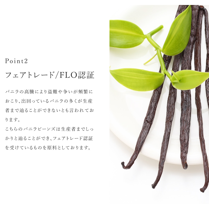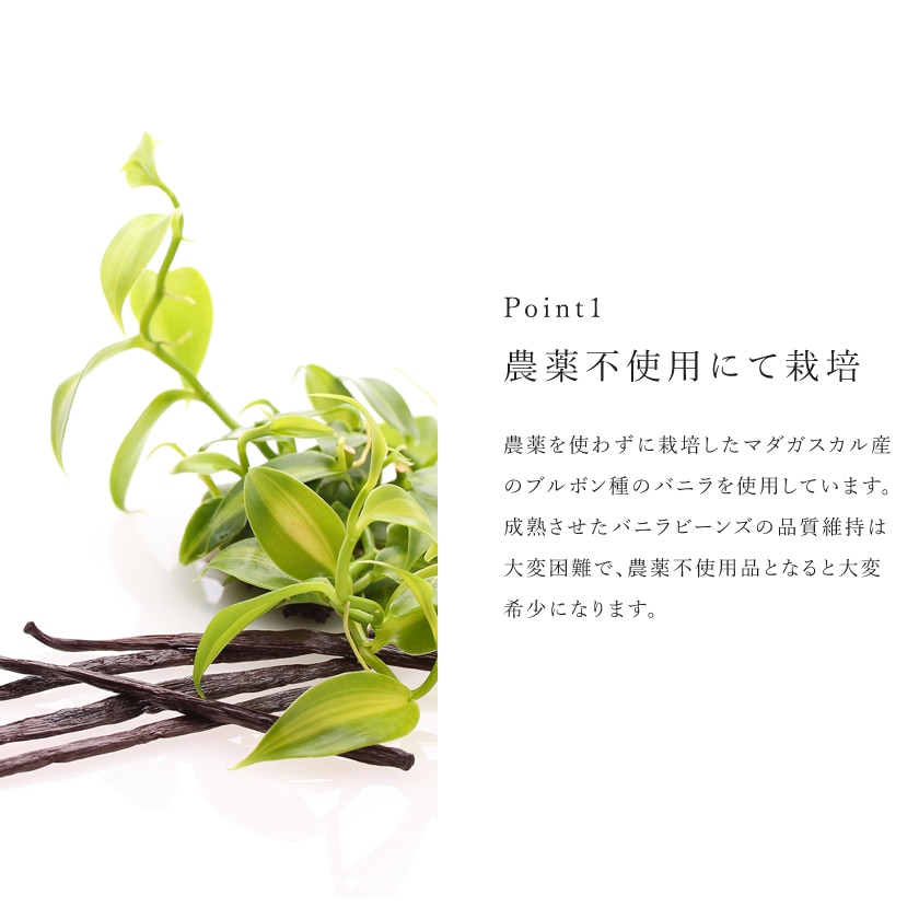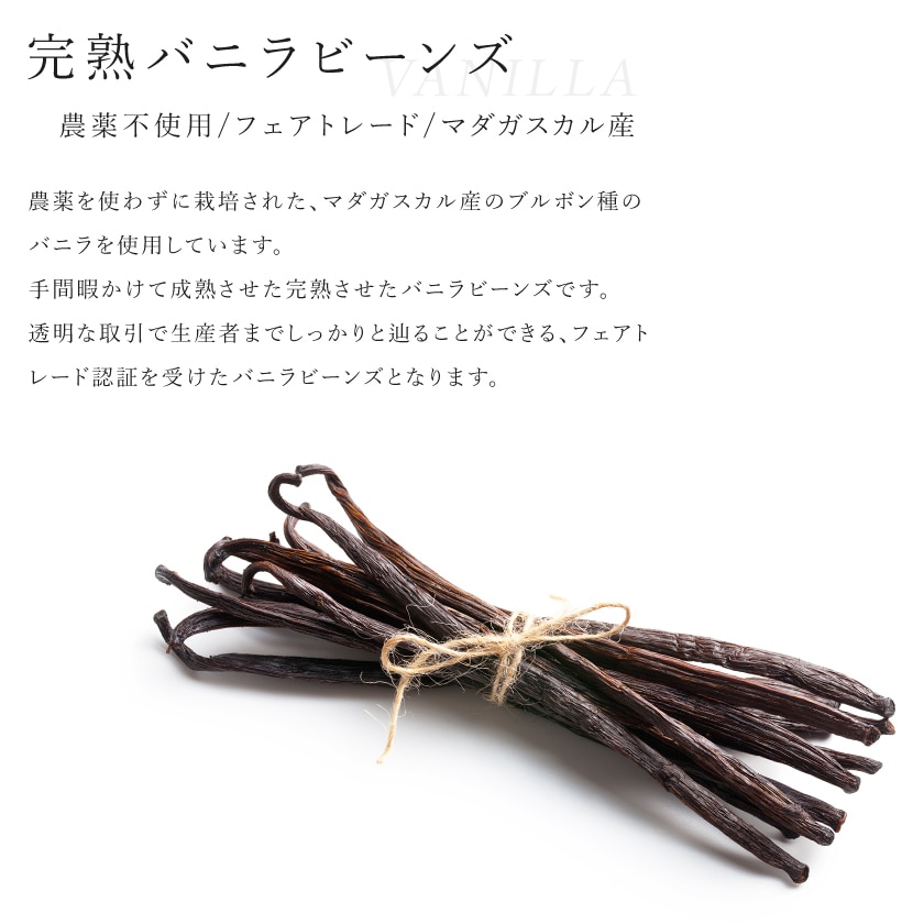 農薬不使用・安心安全にこだわった品質の完熟バニラビーンズを使用しています。 近年バニラビーンズは価格高騰により完熟する前の早摘みがほとんどです。それに比べて最後まで手間暇かけて成熟させたバニラビーンズは、バニラ特有の風味や香りの成分「バニリン」含有量がとても高く品質の良い物となります。 その品質維持は大変困難で、農薬不使用品質となると大変希少です。また特にマダガスカル産は入手困難となっており、バニラの高騰により盗難や争いが頻繁におこり、出回っているバニラのほとんどが生産者まで辿ることができないと言われております。こちらのバニラビーンズは生産者までしっかりと辿ることができ、フェアトレード認証を受けているものを原料としております。 当店はこのようなバニラビーンズをお客様にお届けできることはとても嬉しく思います。