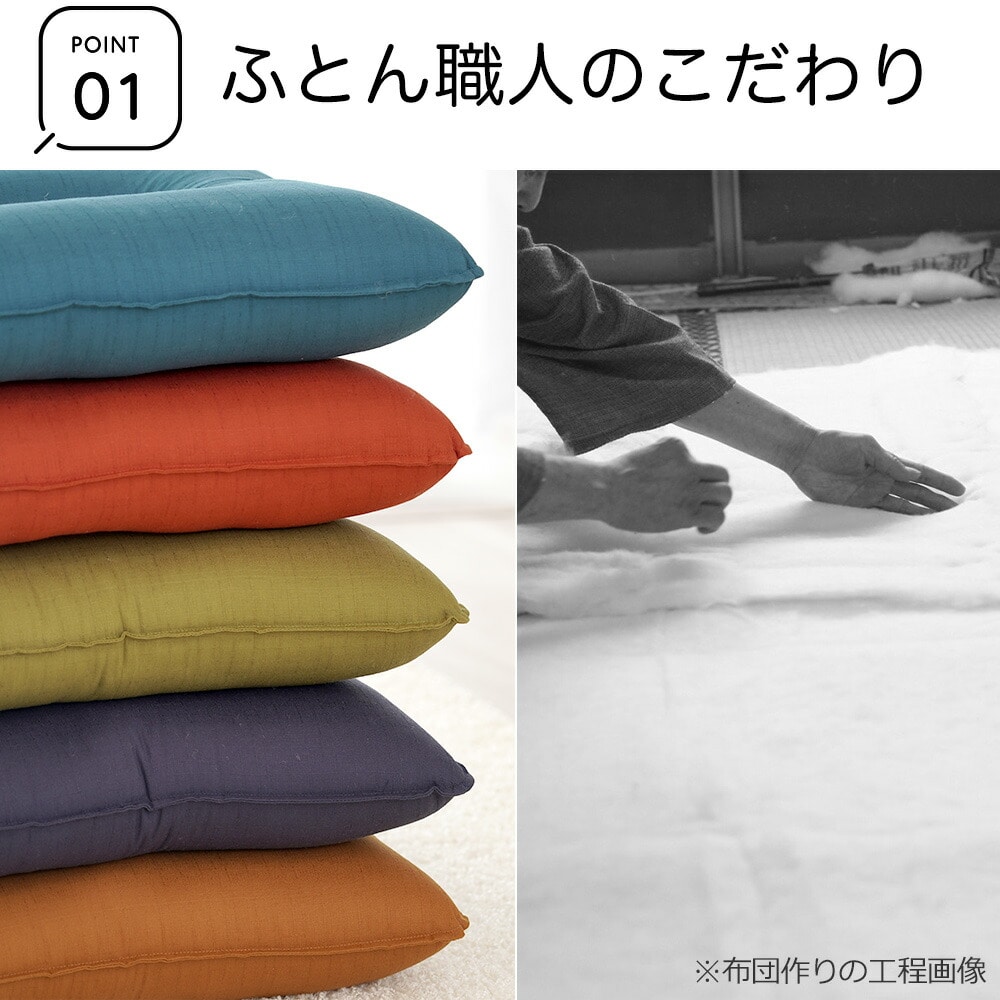 たっぷりの綿を使用しており、ボリューム感とへたりにくさが特徴です。3種類の綿を独自技術で配合した、弾力のあるポリエステル綿です。中素材の一部に「ポリエステル再生チップ」を使用。プラスチック資源を再利用し、環境にも優しい商品です。