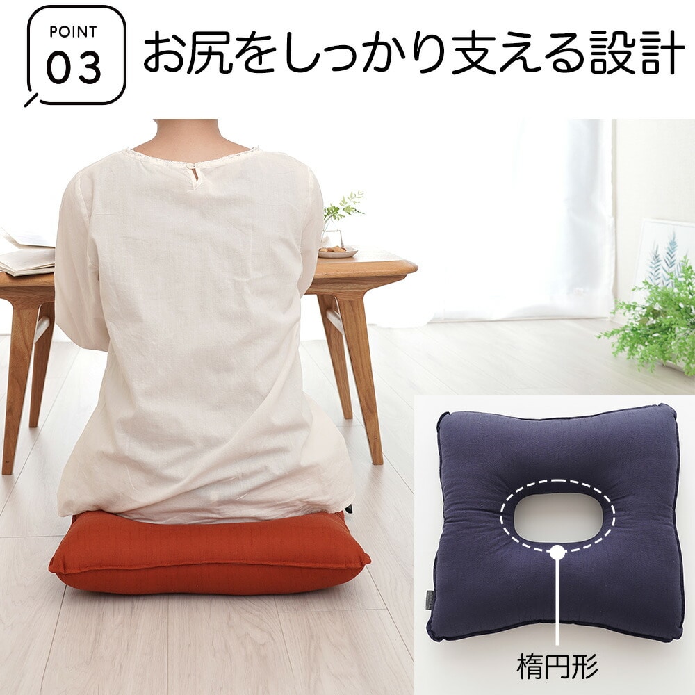 一般的に円座クッションは、中央の穴が正円のものが多いですが、「ふとん屋さんの円座クッション」は楕円に設計されています。これにより、お尻全体を支えることができ、腰回りをしっかりサポートします。