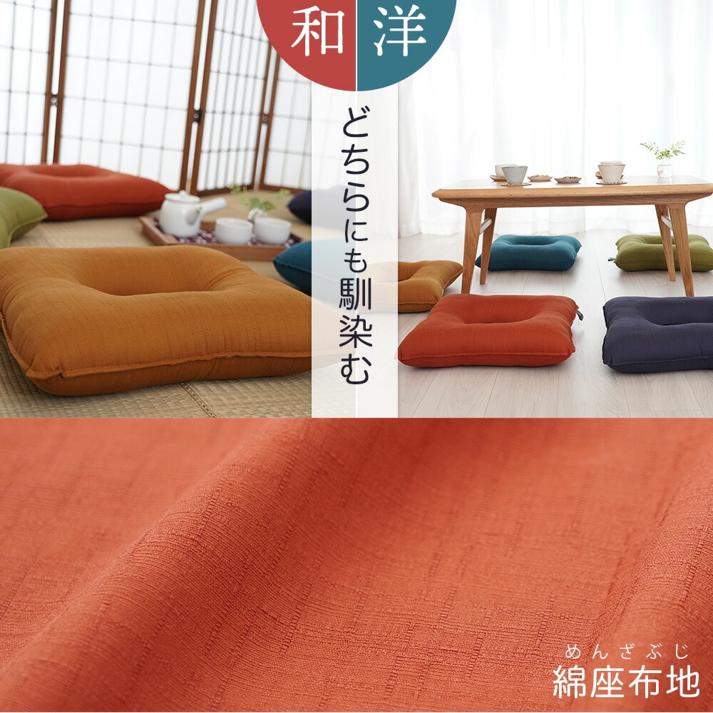 「ふとん屋さんの円座クッション」は生地にもこだわっています。和室でも洋室でも馴染みやすい、落ち着いた印象を与える色合い。この生地は「綿座布地(めんざぶじ)」という座布団によく用いられる素材。丈夫で長くお使いいただけるだけでなく、高級感を演出します。