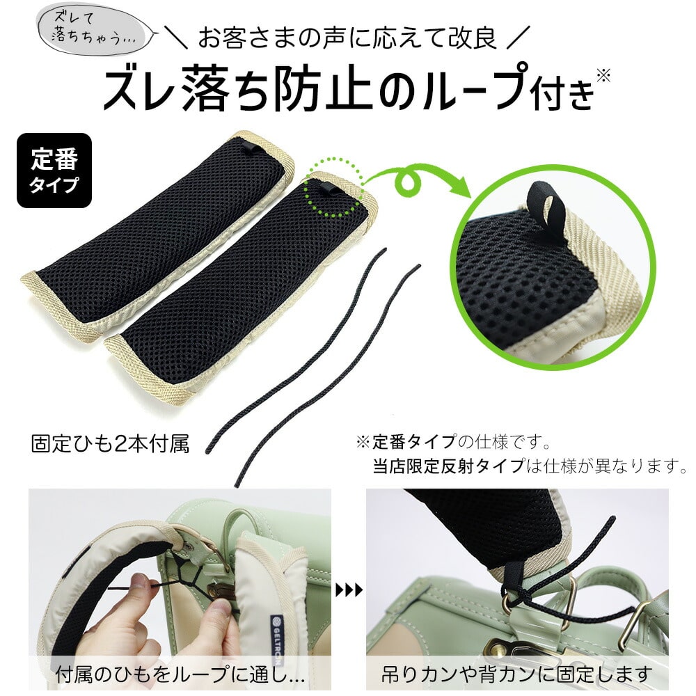 当店限定「反射タイプ」当店とメーカーの協働で、反射タイプが当店限定登場!車やバイクのライトを強力に反射する生地を使用しています。通学中のお子さまの存在をドライバーに知らせるので、曇天や薄暗い道でも安心。さらに、ズレ防止ひもは本体と一体型で、スナップボタンで簡単に装着できます。また、面ファスナーの接着面が広いので、幅広タイプの肩ベルトにも装着可能です。お子さまの安全と快適さを両立した、進化したジェルトロン ランドセル用ショルダーパッドです。