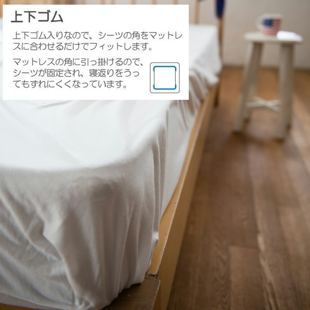 上下ゴム上下ゴム入りなので、シーツの角をマットレスに合わせるだけでフィットします。マットレスの角に引っ掛けるので、シーツが固定され、寝返りをうってもズレにくくなっています。