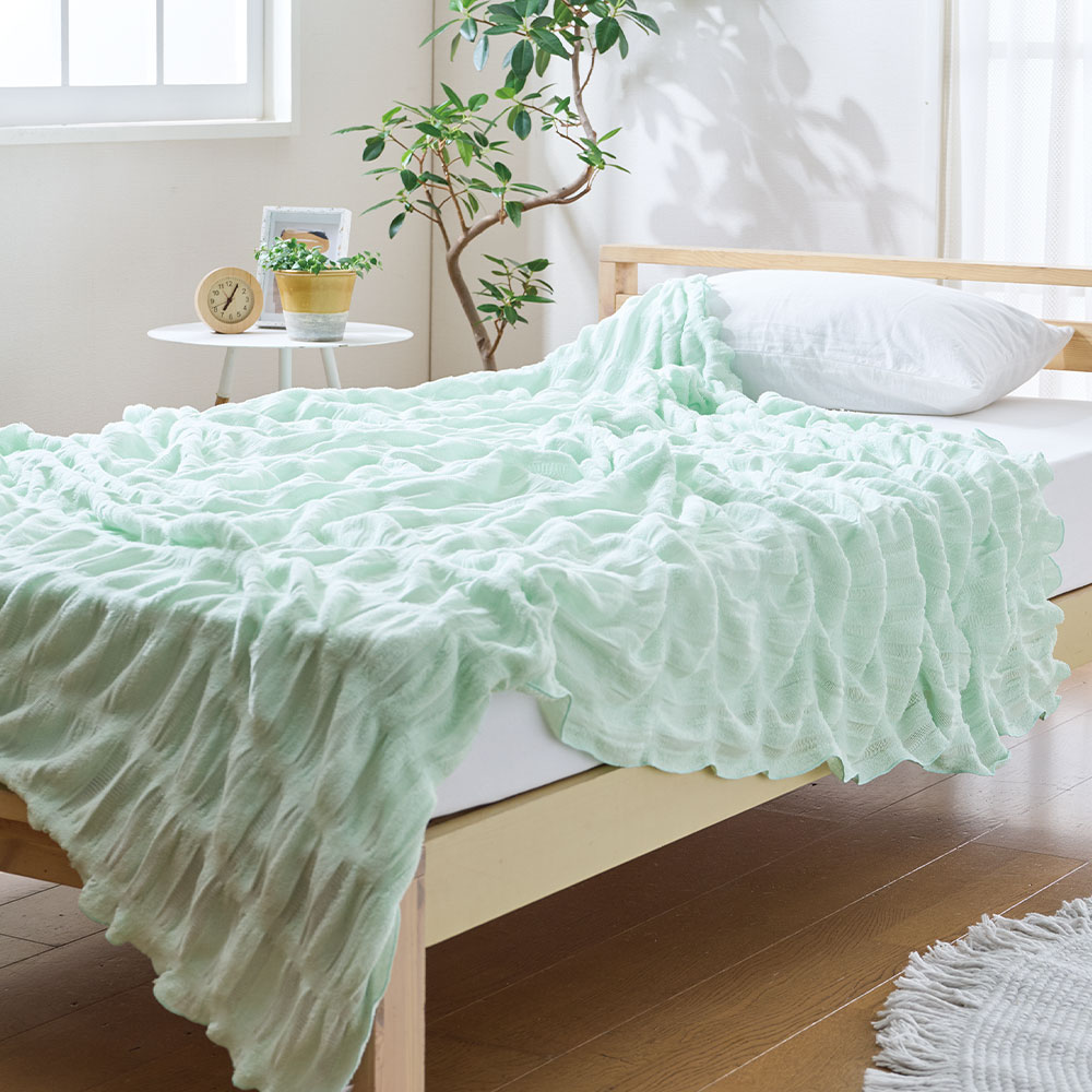 心地よい風に包まれるような風合いと優れた通気性で、睡眠中の不快な熱やムレをしっかり放湿。肌と生地に隙間を作る特許取得の「くしゅくしゅ加工」により、暑苦しさを感じさせません。そよ風ケットで夏の夜を軽やかに、そして穏やかにお過ごしください。