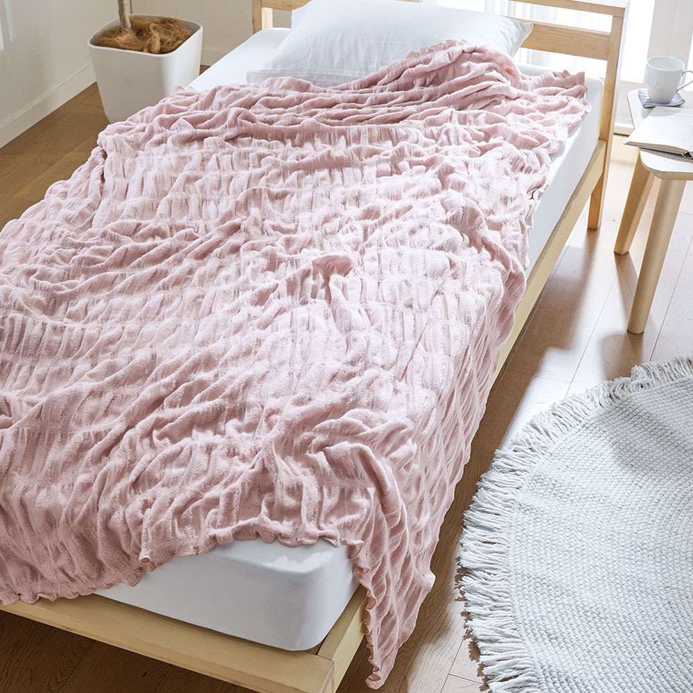 「そよ風ケット」は、特許取得の「くしゅくしゅ加工」により、生地と身体の間に心地よい隙間を作り出します。