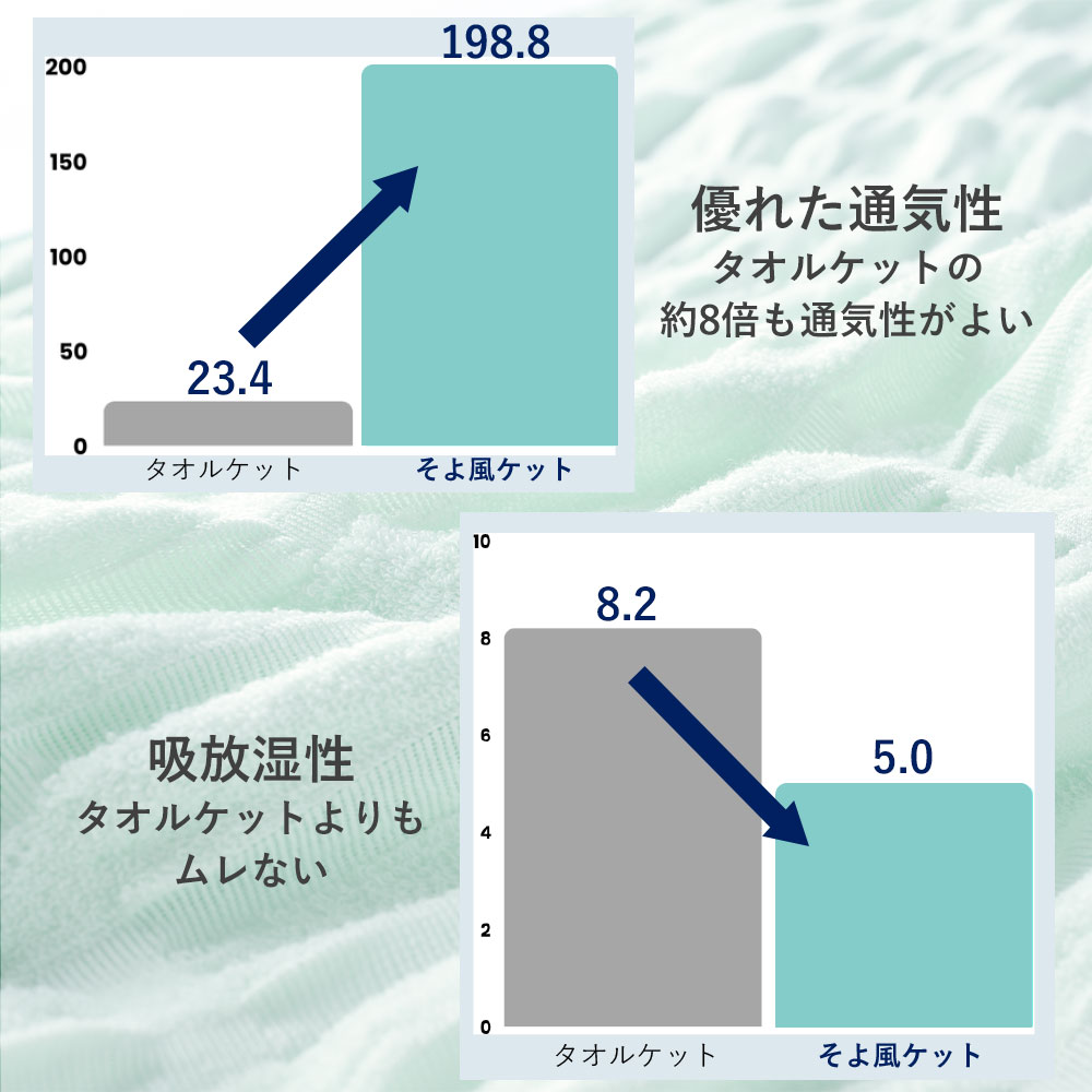 2つの素材の特徴を組み合わせることで、通気性はタオルケットの約8倍も高い結果となりました。