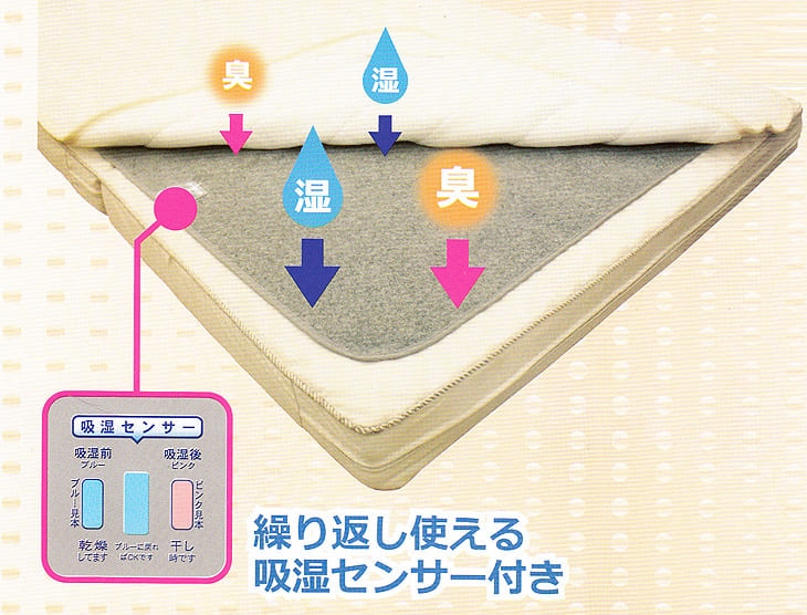 敷き布団やベッドパットの下に敷いて1年中使える除湿シートです。1平方メートル辺りの吸湿量が約120cc。繰り返し使える吸湿センサー付きです。吸湿シートはお洗濯が可能ですので、いつでも清潔にお使いいただけます。