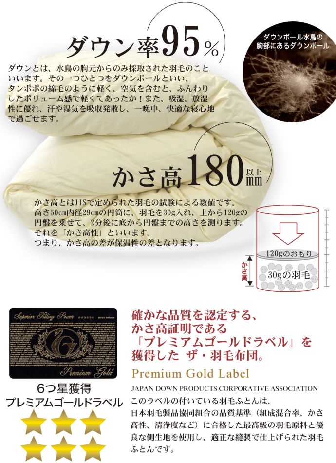 かさ高とはJISで定められた羽毛の試験による数値。高さ50cm内径29cmの円筒に、羽毛を30g入れ、上から120gの円盤を乗せて、2分後に底から円盤までの高さを測ります。それを「かさ高性」といい、かさ高の差が保温性の差となります。※かさ高は決して、ふとんの厚みのことではありません。