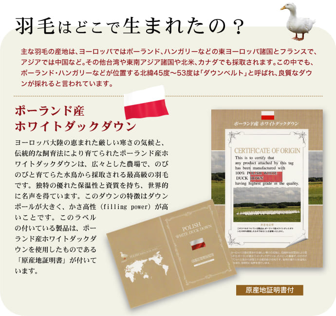 このラベルの付いている製品は、ポーランド産ホワイトダックダウンを使用したものである「原産地証明書」が付いています。