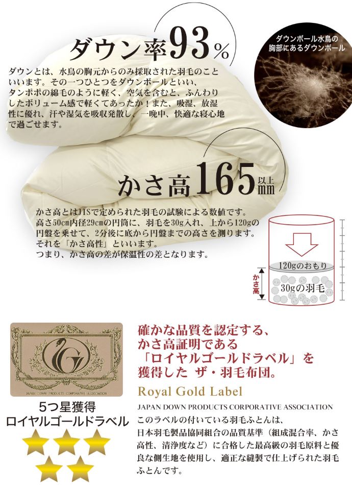 かさ高とはJISで定められた羽毛の試験による数値。高さ50cm内径29cmの円筒に、羽毛を30g入れ、上から120gの円盤を乗せて、2分後に底から円盤までの高さを測ります。それを「かさ高性」といい、かさ高の差が保温性の差となります。※かさ高は決して、ふとんの厚みのことではありません。