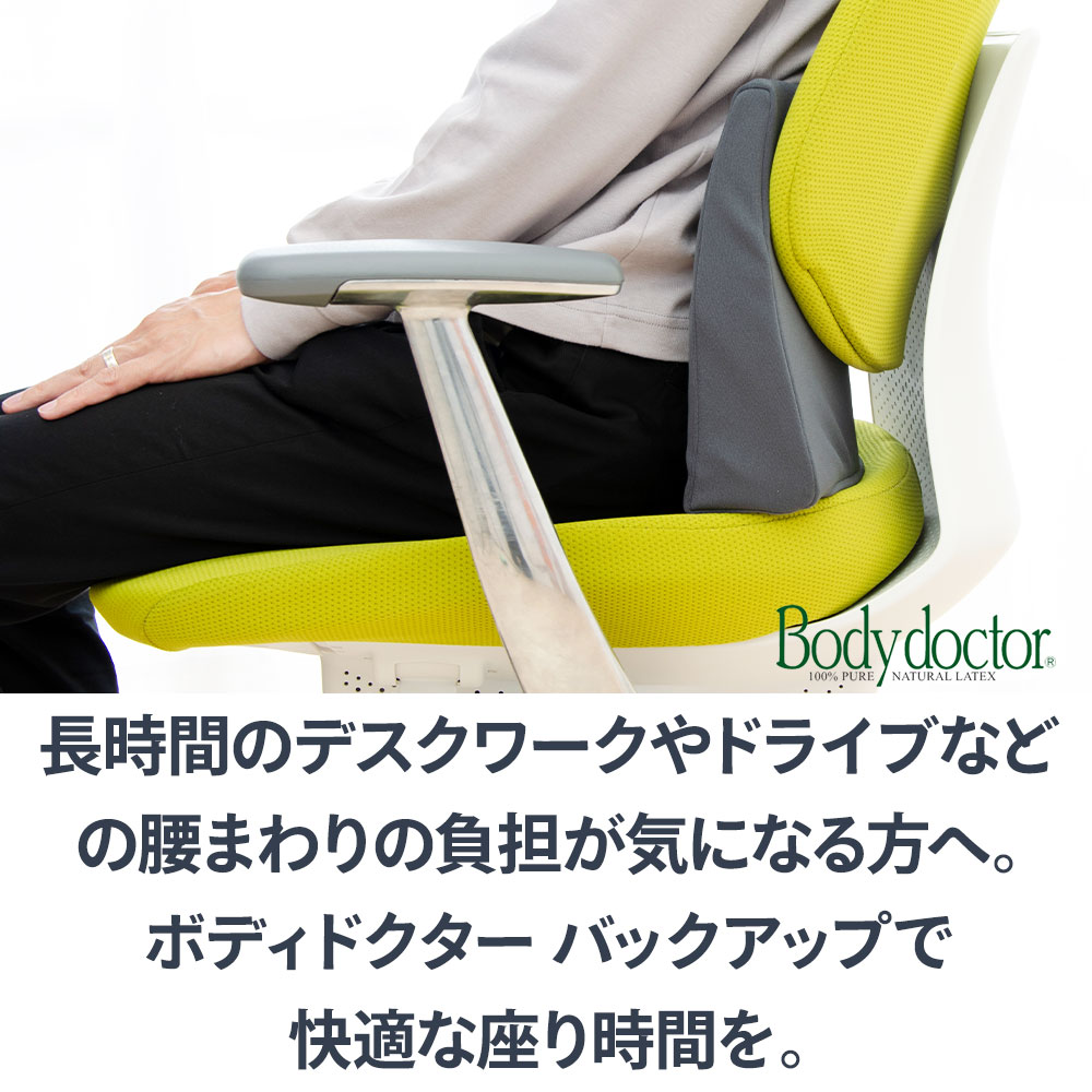 ボディドクター®バックアップは、、厳選された天然100%ヴァージンラテックスを使用したサポートクッションです。素材独特の弾力性「正反発®」効果により、腰と椅子の隙間を優しく埋め、腰をぴたりとサポートして正しい姿勢へと自然に導きます。