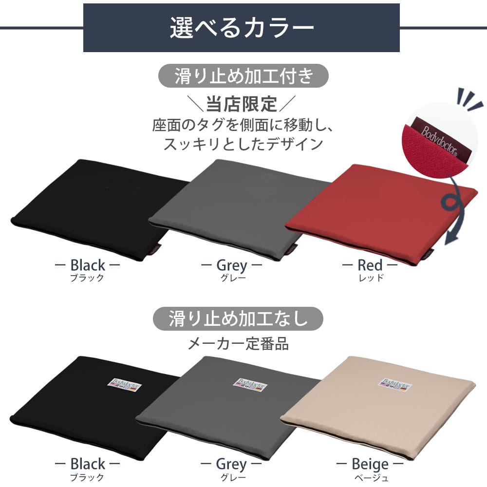 ボディドクター®さまと当店のコラボで実現した当店オリジナルタイプは、座面のタグを側面にしたシンプルなデザイン。どんなお部屋やシーンにもなじみやすい「ブラック」、「グレー」、「レッド」の3カラーのご用意。シンプルなデザインは、年齢や性別を問わず、プレゼントやギフトに最適です。また、使いやすさにもこだわり、裏面に滑り止め加工をしています。 メーカー定番品デザインの、滑り止め加工なしは、「ブラック」、「グレー」、「ベージュ」の3カラーから選べます。