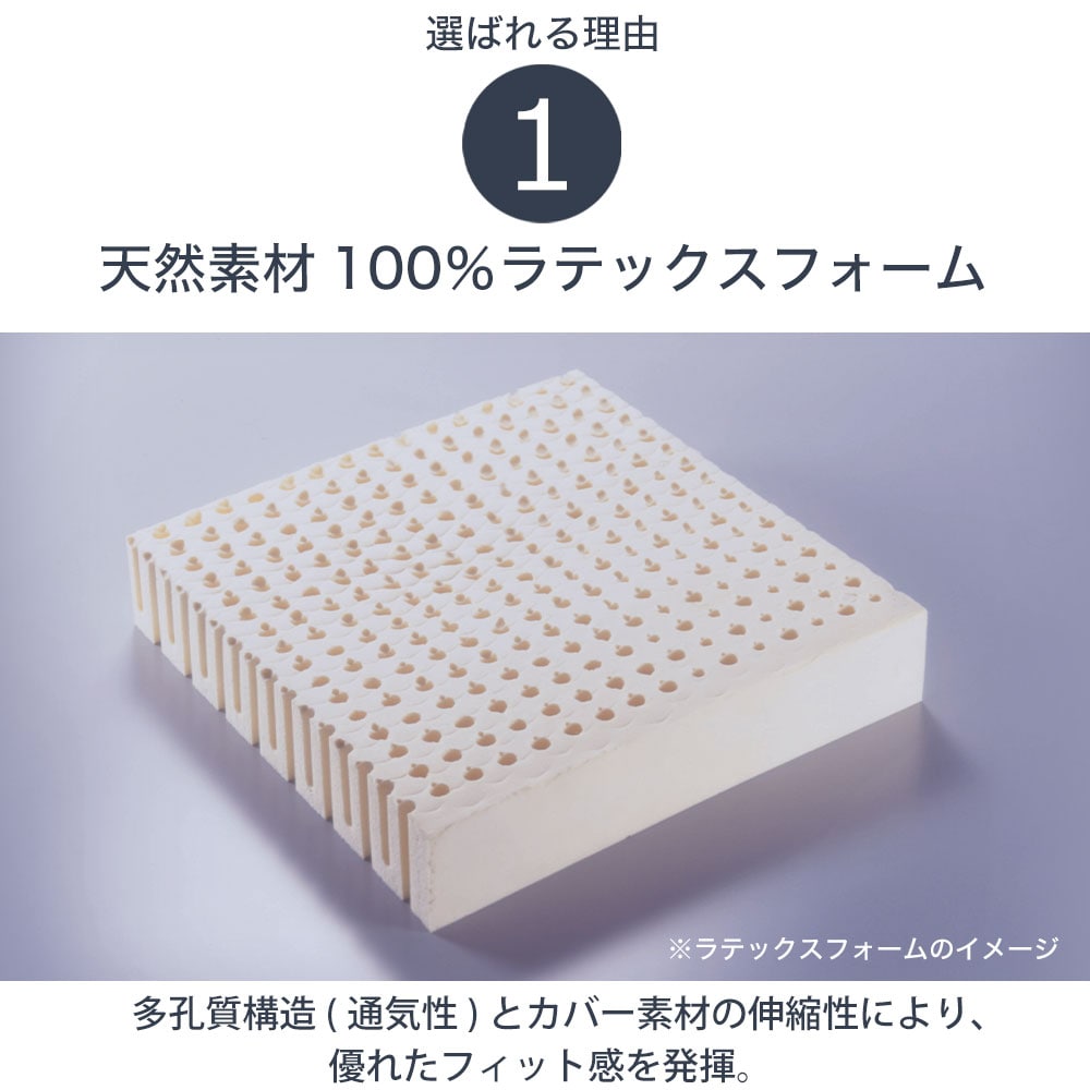 100%天然のヴァージンラテックスフォームなので、耐久性が高く、折りたたんでもへたりにくいのが特徴です。 天然の抗菌・除菌作用があり、ダニやカビを寄せ付けず、その効果は15年経過しても低下しません。 さらに、環境にも配慮されており、廃棄後は約2~3年で土に還り、焼却してもダイオキシンは一切発生しない、環境にやさしい素材です。
