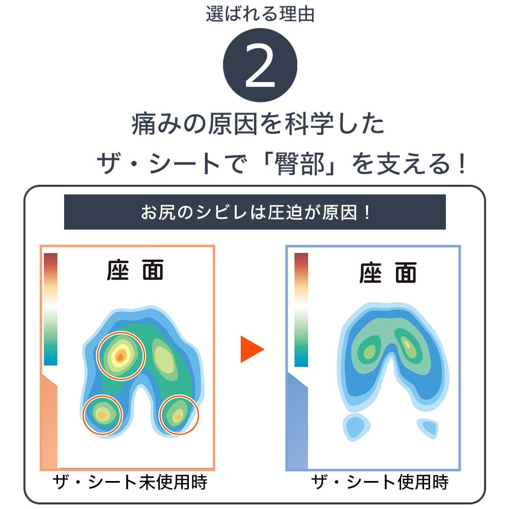 お尻にかかる体圧を分散。長時間座り姿勢でいると足を組んでみたりして、お尻の疲れを解消したくなるのは、皮下の毛細血管が自身の体重で圧迫されてしまうことが原因です。適度な弾力性を持つ「正反発®ラテックスフォーム」がお尻をサポートします。