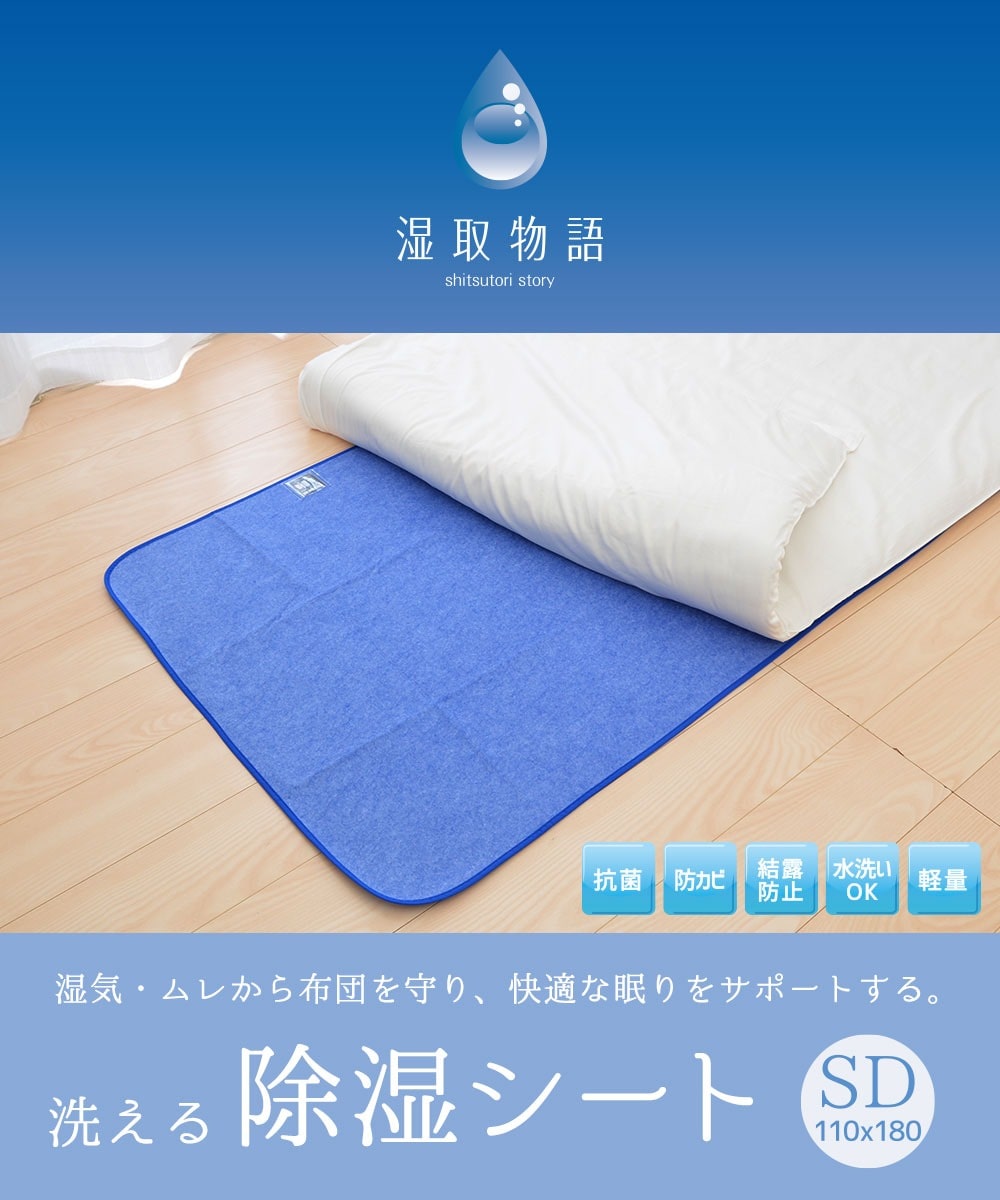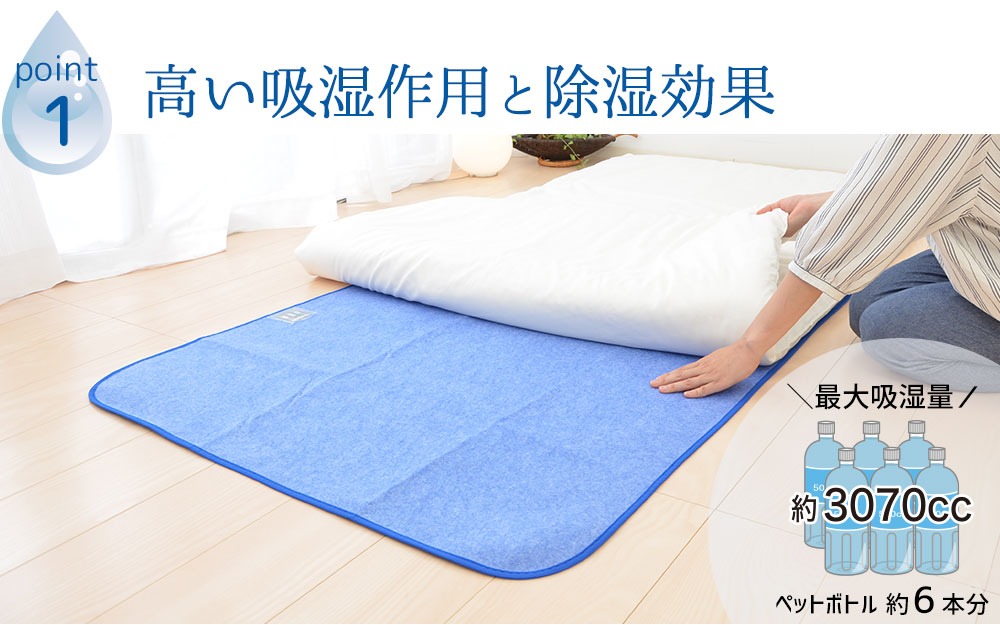 私たちは一晩で、おおよそコップ一杯(200~500cc)ほどの寝汗をかくと言われています。湿取物語(セミダブルサイズ)の吸水量は、最大3070ccと吸水効果抜群。布団の湿気をしっかりと取り除き、床の結露予防・カビの抑制効果にも繋がります。また、高い湿度時に素早く反応する「シリカゲル B型」を採用しているので布団の湿気滞在を最小限にします。