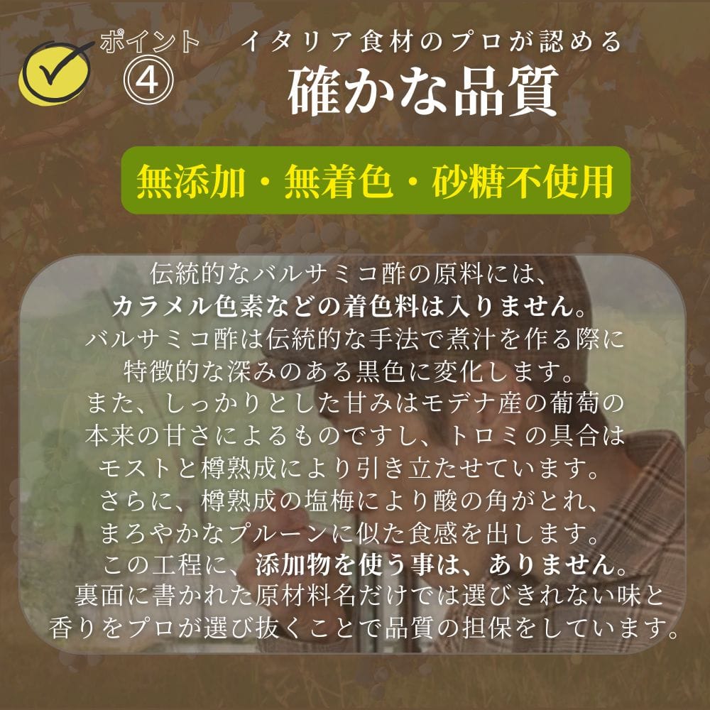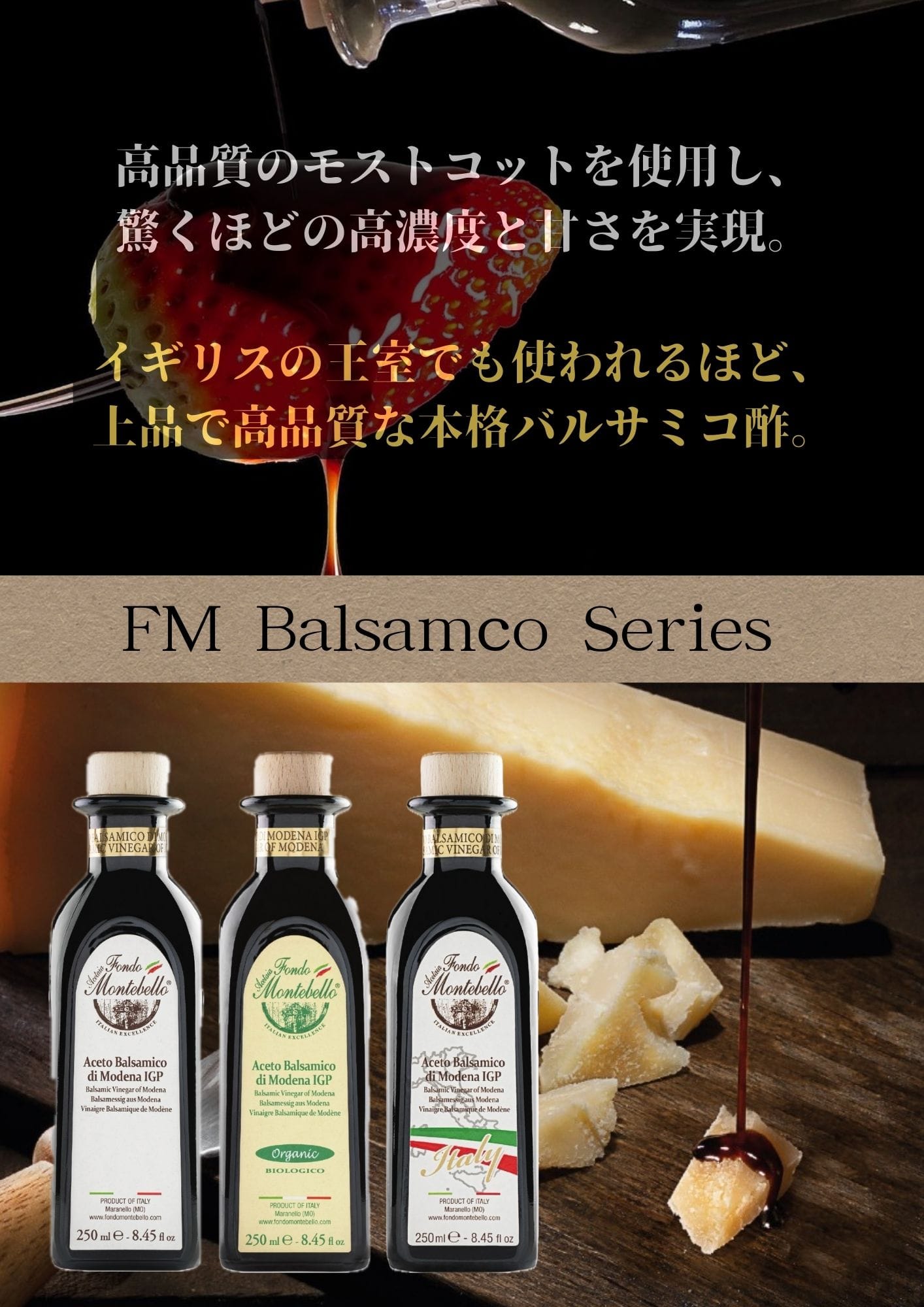 ≪商品説明≫ ◆フォンドモンテベロのFM03の熟成度合は、実は超高品質のモスト(葡萄の煮汁)を使用することで、12年で味を出しているため、従来は何万円もするような熟成バルサミコが、格安で提供できています。 ◆フォンド モンテベロ バルサミコの『FMシリーズ』で最も高い濃度を持つタイプで、最高級のオーガニックタイプです。角の取れた酸味に、際立ってトロける甘さを持ち合わせた、優しくも味わい深い上級のバルサミコです。 ◆肉料理に留まらず、アイスクリームやフルーツなどにも使えるコクと甘みに加え、長期熟成のみが出し得る深い味わいが楽しめます。 ◆FM03は樫の木(オーク)樽での12年熟成によるバニラの様な食欲をそそる香りが味わえます。 ◆フォンド モンテベロのFMバルサミコシリーズは、もはや『お酢』というより美味しい『ソース』といった表現がしっくりくるほどです。 【名称】醸造酢(ぶどう酢) 【原材料名】濃縮ぶどう果汁、ワインビネガー 【内容量】250ml 【酸度】6% 【原産国名】イタリア 【保存方法】直射日光・高温多湿な場所を避けて保存して下さい