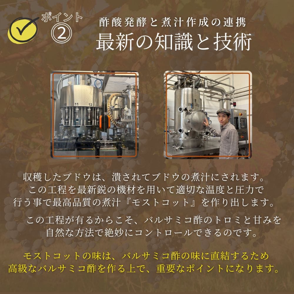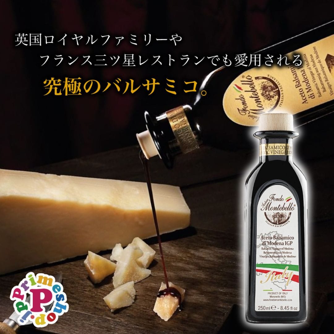 ≪商品説明≫ ◆フォンド モンテベロ バルサミコの『FMシリーズ』でITALYの名を冠した最も汎用性の高いタイプです。爽やかな酸味に、際立ってトロける甘さを持ち合わせた、上級のバルサミコです。 ◆肉料理に留まらず、サラダやグリルなどにも使える汎用度の高いコ粘度と酸味、甘みのバランスです。長期熟成のみが出し得る深い味わいが楽しめます。 ◆FM04は栗の木の樽での熟成によるタンニンの乾いたような渋みに加えて桜の木樽での熟成による甘い香りと味わいが特徴です。 ◆フォンド モンテベロのFMバルサミコシリーズは、もはや『お酢』というより美味しい『ソース』といった表現がしっくりくるほどです。 ◆フォンドモンテベロのFM04の熟成度合は、実は超高品質のモスト(葡萄の煮汁)を使用することで、6年で味を出しているため、従来は何万円もするような熟成バルサミコが、格安で提供できています。 【名称】醸造酢(ぶどう酢) 【原材料名】ワインビネガー、濃縮ぶどう果汁 【内容量】250ml 【酸度】6% 【原産国名】イタリア 【保存方法】直射日光・高温多湿な場所を避けて保存して下さい