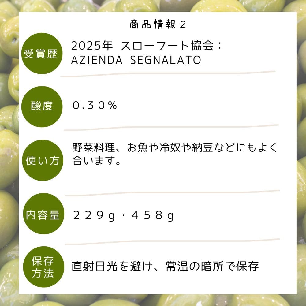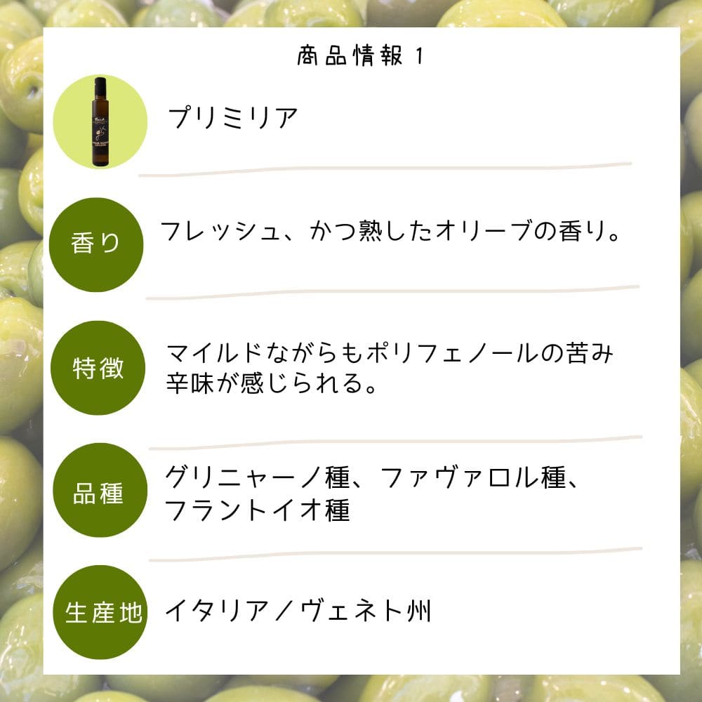 北イタリア・ヴェネト州のヴェローナ丘陵で最も標高の高い場所にあるボナミーニ家が持つ自家農園で栽培されたオリーブのみで搾油されたエキストラバージンオリーブオイルです。 グリニャーノ種、ファヴァロル種、フラントイオ種(カーザリーヴァ)の3品種からなる「プリミリア」は、マイルドなテイストで、ルッコラやナスなど苦みのある野菜によく合います。 イタリア料理だけでなく、焼き魚や蒸し野菜、生野菜のサラダなどの日本の食卓にもどんどん振りかけてお楽しみいただけます。 【名称】食用オリーブ油 【原材料名】食用オリーブ油 【特徴】フレッシュかつ熟したオリーブの香り。マイルドな味わいでわずかにポリフェノールの苦みが感じられます。 【内容量】500ml 【オリーブ品種】グリニャーノ、ファヴァロル、フラントイオ 【酸度】0.30% 【原産地】イタリア/ヴェネト州 【保存方法】直射日光を避けて常温の暗所で保存 【輸入者】株式会社小川正見&Co.