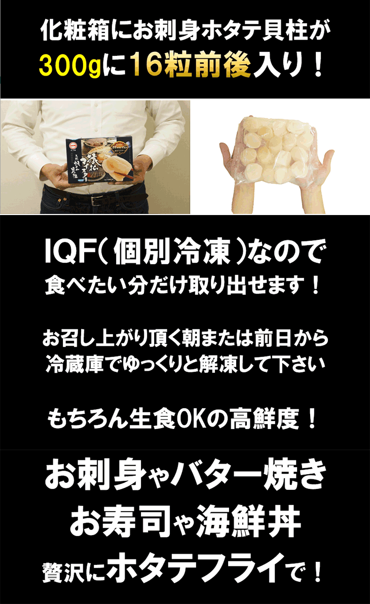 その後、貝柱をIQF急速凍結(一玉一玉バラ凍結)で仕上げたワンフローズン製法です!