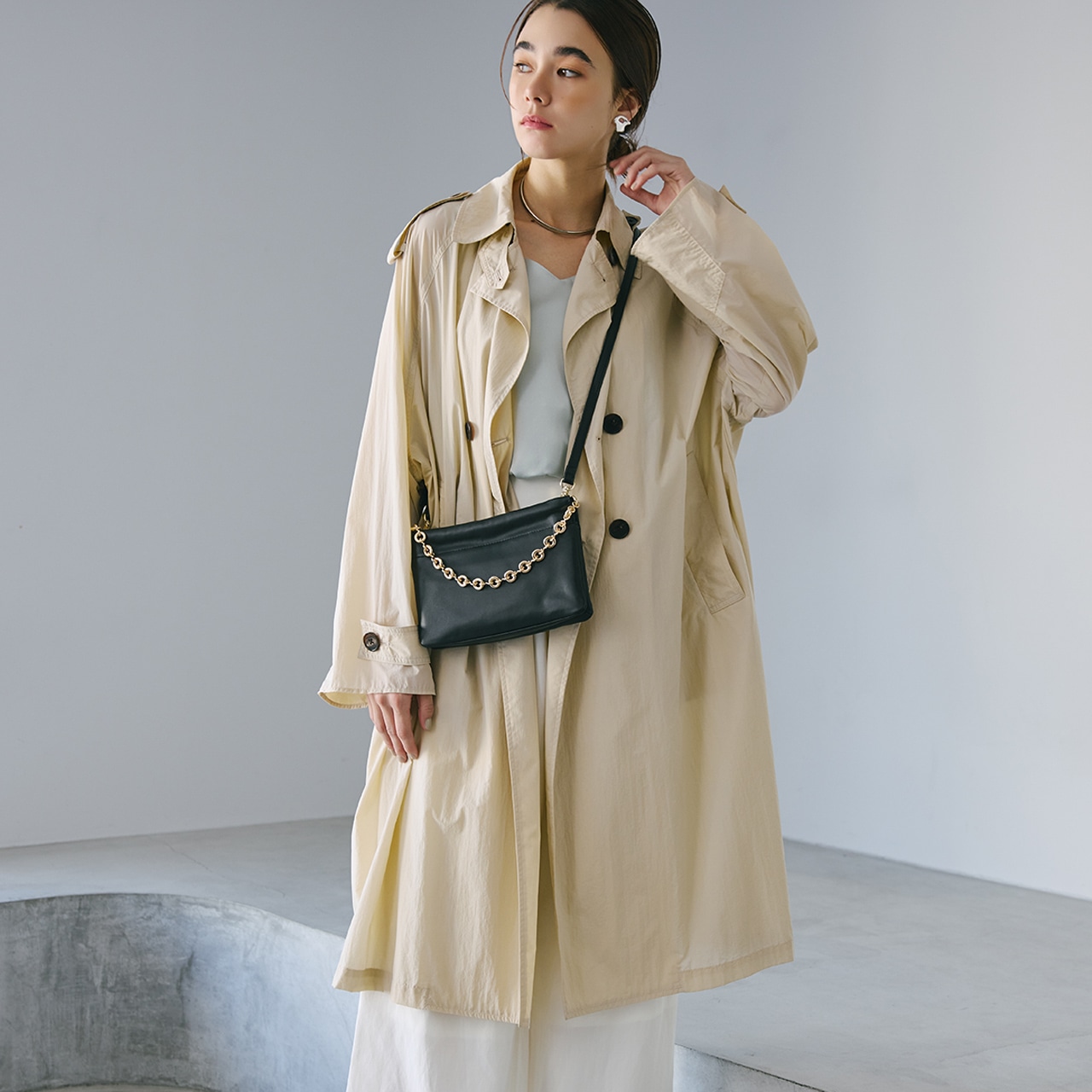 オールシーズン活躍するレザーポシェット。ソフトな風合いのレザーに、ゴールドカラーの丸チェーンで華やかさをプラス。コンパクトサイズでありながら、内側は2部屋に分かれた小物を整理しやすいつくりで、貴重品などの収納に便利なファスナーポケット付き。入れる荷物の量に合わせてマチが開くので見た目以上に収納できます。ハンドル部分を絞り巾着風に表情を変えて楽しめるほか、着脱可能なレザーショルダーベルト付きで、ワンショルダーや斜めがけなど装いや気分に合わせて楽しめます。ブラック、オフホワイト、ベージュの3色をラインナップ。【TREASURE TOPKAPI / トレジャー トプカピ】Sense is a treasure ーその "感性"が宝物ー大人の女性の気分を上げる、品が良く楽しいバッグブランドです。Unique senseをコンセプトに、 TREASUREは "独創的" で心くすぐるアイテムを提供します。※商品画像はサンプルのため、色味やサイズ、仕様等に変更が生じる場合がございますので、予めご了承ください。