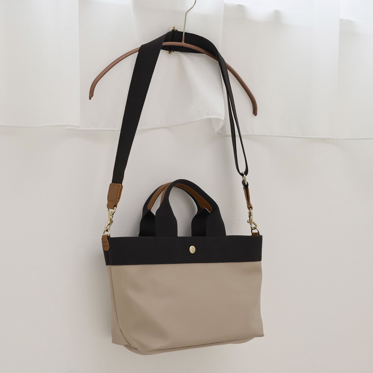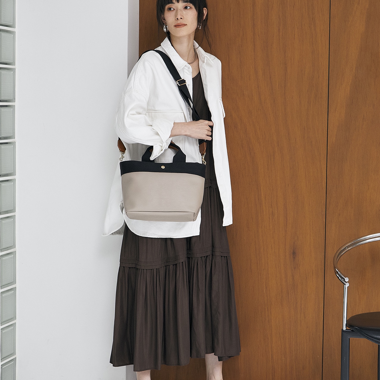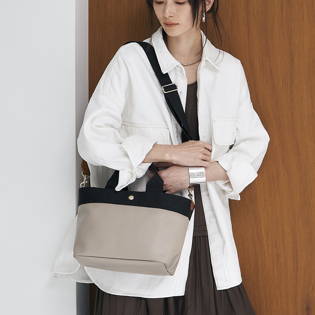 《どんなスタイルにも寄り添う、理想的な定番バッグ》人気シリーズ・RIPPLEのトートバッグにショルダーベルトが付き、さらに便利にアップデート!上品で削ぎ落とされたデザインの中にも、動きのある繊細な型押し生地とトレンド感のある太ベルトがスタイリッシュなアクセントに。レザーのコンビネーションを効かせたハンドルはあえて短めに設計し、アクティブすぎない都会的なバランスを実現します。天面はファスナー仕様で肩掛け時にも安心。コンパクトなサイジングながらたっぷりとしたマチが見た目以上の収納力を発揮し、きっとどこへ行くにも手放せなくなるはず。リプル…弾力と適度な硬さを備える発砲PVCにさざ波のような型押しを施した、クールな表情が人気のシリーズ。傷や汚れが目立ちにくく軽量で、デイリーユースに最適。国内の工場で丁寧に作られています。