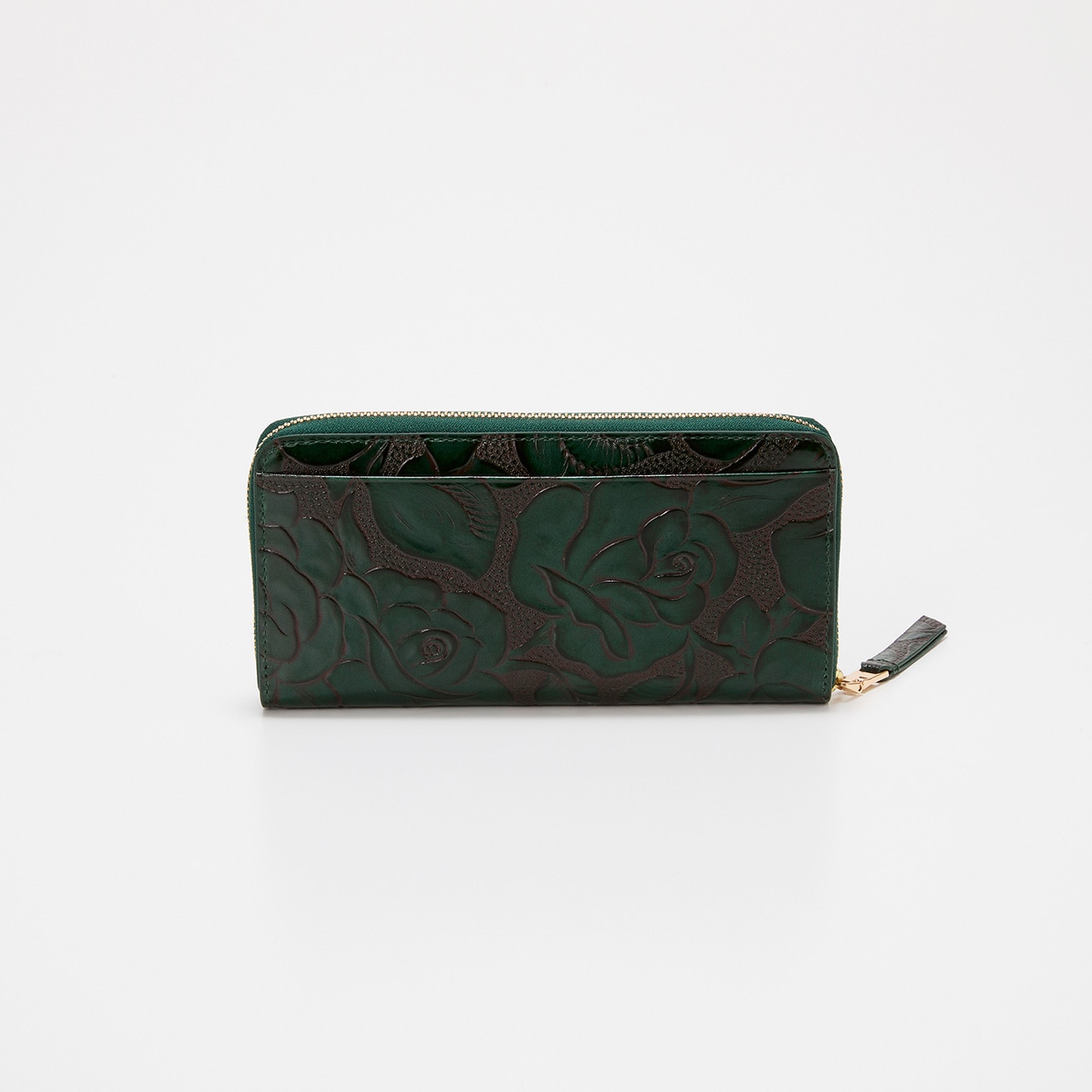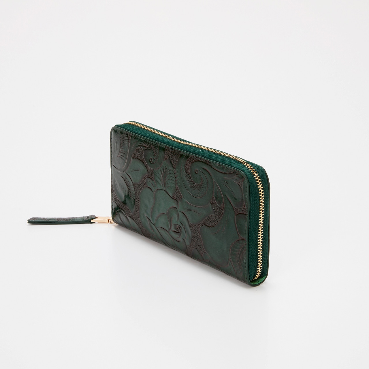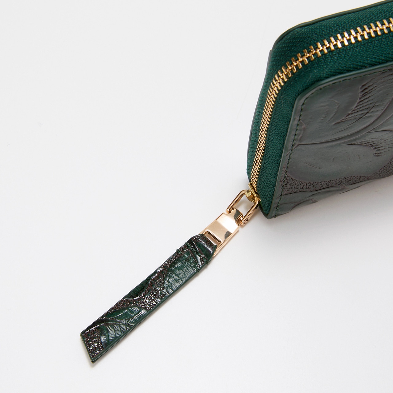 深みのあるカラーにローズの型押しが映える長財布。バングラデシュのフルタンニン染めレザーに職人がひとつひとつ型押しし、サンドペーパーで丁寧にこすってツヤを出したクラフト感あふれるデザイン。口が大きく開くラウンドファスナータイプで、中央にはファスナータイプのコインポケット、両サイドにはマチ付きのカードポケットが充実。小銭やカードの出し入れがしやすく、紙幣や領収書などを分けて収納できるので使い勝手抜群です。グリーンとイエローの2色をラインナップしています。【TREASURE TOPKAPI / トレジャー トプカピ】Sense is a treasure ーその "感性"が宝物ー大人の女性の気分を上げる、品が良く楽しいバッグブランドです。Unique senseをコンセプトに、 TREASUREは "独創的" で心くすぐるアイテムを提供します。※商品画像はサンプルのため、色味やサイズ、仕様等に変更が生じる場合がございますので、予めご了承ください。