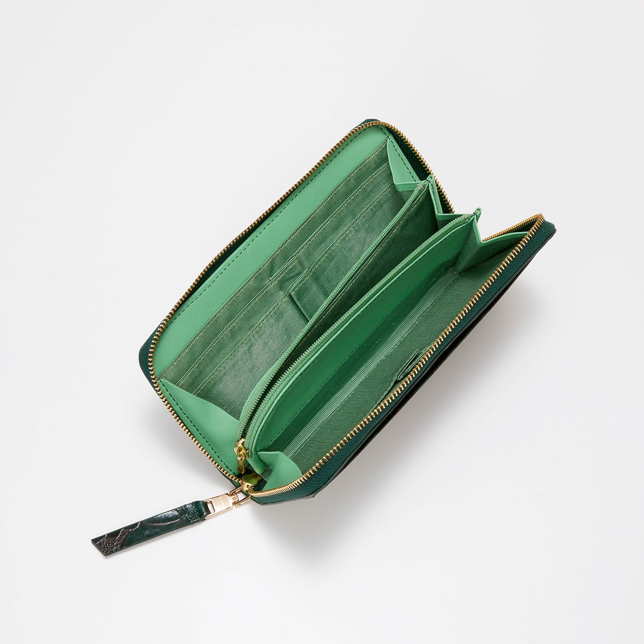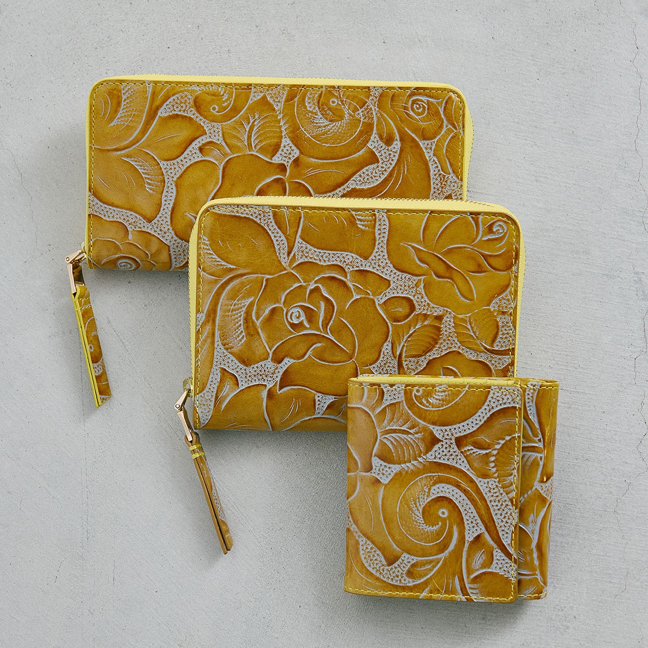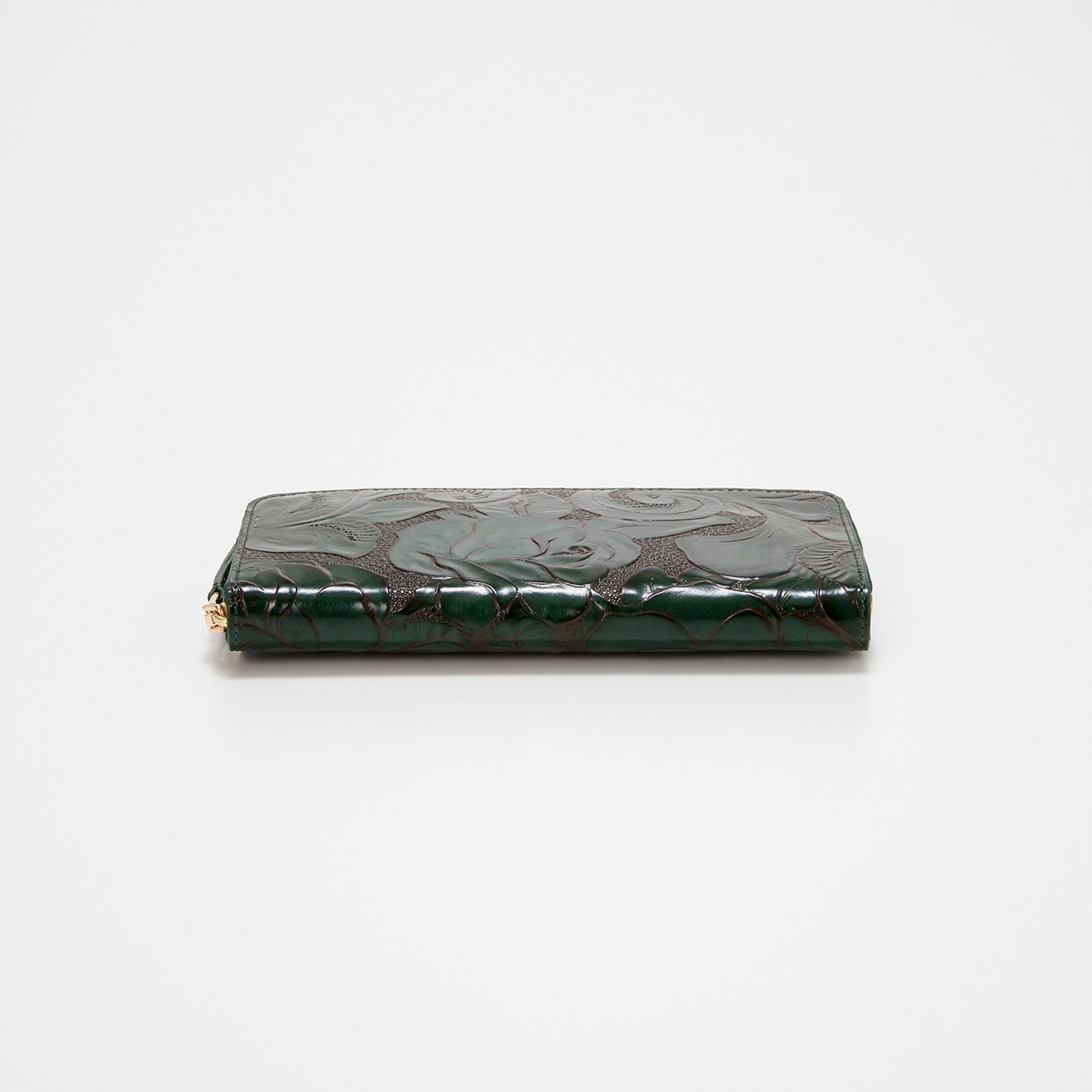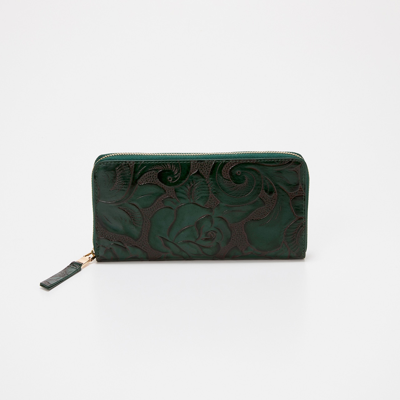 深みのあるカラーにローズの型押しが映える長財布。バングラデシュのフルタンニン染めレザーに職人がひとつひとつ型押しし、サンドペーパーで丁寧にこすってツヤを出したクラフト感あふれるデザイン。口が大きく開くラウンドファスナータイプで、中央にはファスナータイプのコインポケット、両サイドにはマチ付きのカードポケットが充実。小銭やカードの出し入れがしやすく、紙幣や領収書などを分けて収納できるので使い勝手抜群です。グリーンとイエローの2色をラインナップしています。【TREASURE TOPKAPI / トレジャー トプカピ】Sense is a treasure ーその "感性"が宝物ー大人の女性の気分を上げる、品が良く楽しいバッグブランドです。Unique senseをコンセプトに、 TREASUREは "独創的" で心くすぐるアイテムを提供します。※商品画像はサンプルのため、色味やサイズ、仕様等に変更が生じる場合がございますので、予めご了承ください。