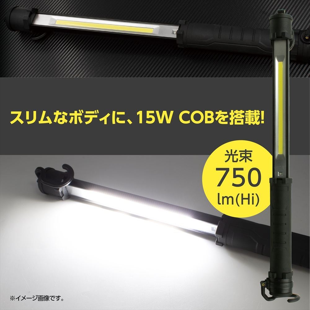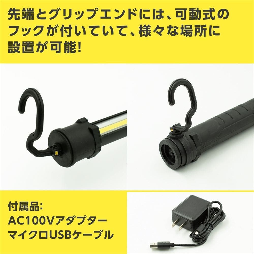 COBを搭載した、充電式の作業用ライトです。内蔵バッテリーはリチウムイオンバッテリーを搭載し、明るさLoで最大約5時間の点灯が可能。先端とグリップエンドに可動式のフックが付いているので、吊り下げるだけでなく、横方向にかけることもできます。