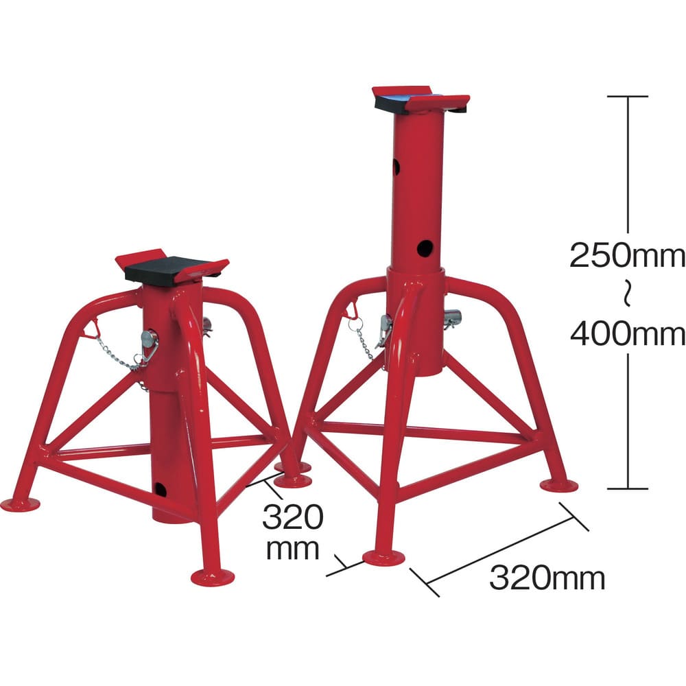 ●低床タイプなので、最高位の低いジャッキを使用する際や、低い位置で作業する場合などに最適です。●また、ゴムパッド付きなので、当たり面に傷を付けづらくなっています。●全長(mm):250~400●耐荷重(t):3●組入数(脚):2●耐荷重:3t(1脚)●高さ:1段階/250mm、2段階/325mm、最高位/400mm(ゴムパッド装着時) 質量8.000kg