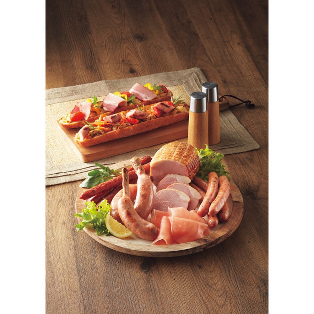 ●生ハムロース(スライス)40g、炭火焼ベーコン(スライス)80g、スティッククラコウ(ソフトサラミソーセージ)80g、燻しロースハム300g、燻しモモハム300g、荒挽ウインナー100g、ピルカウインナー120g、骨付ソーセージ180g、豚角煮160g