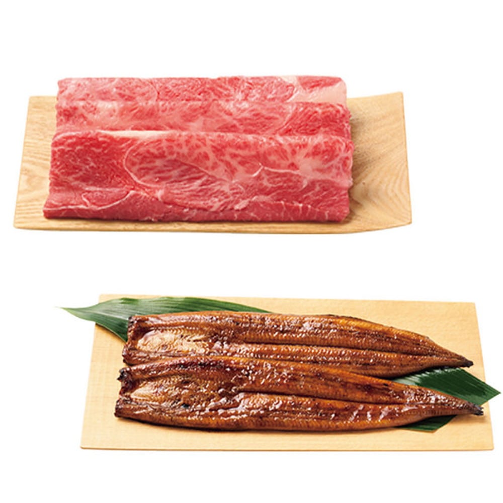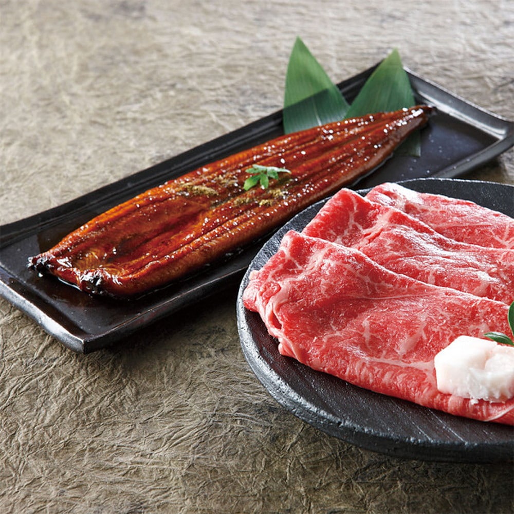 ●兵庫県産神戸ビーフ(モモすき焼き用)200g、うなぎ蒲焼105g×2(うなぎ:鹿児島県産)、蒲焼きのたれ(山椒付)×2