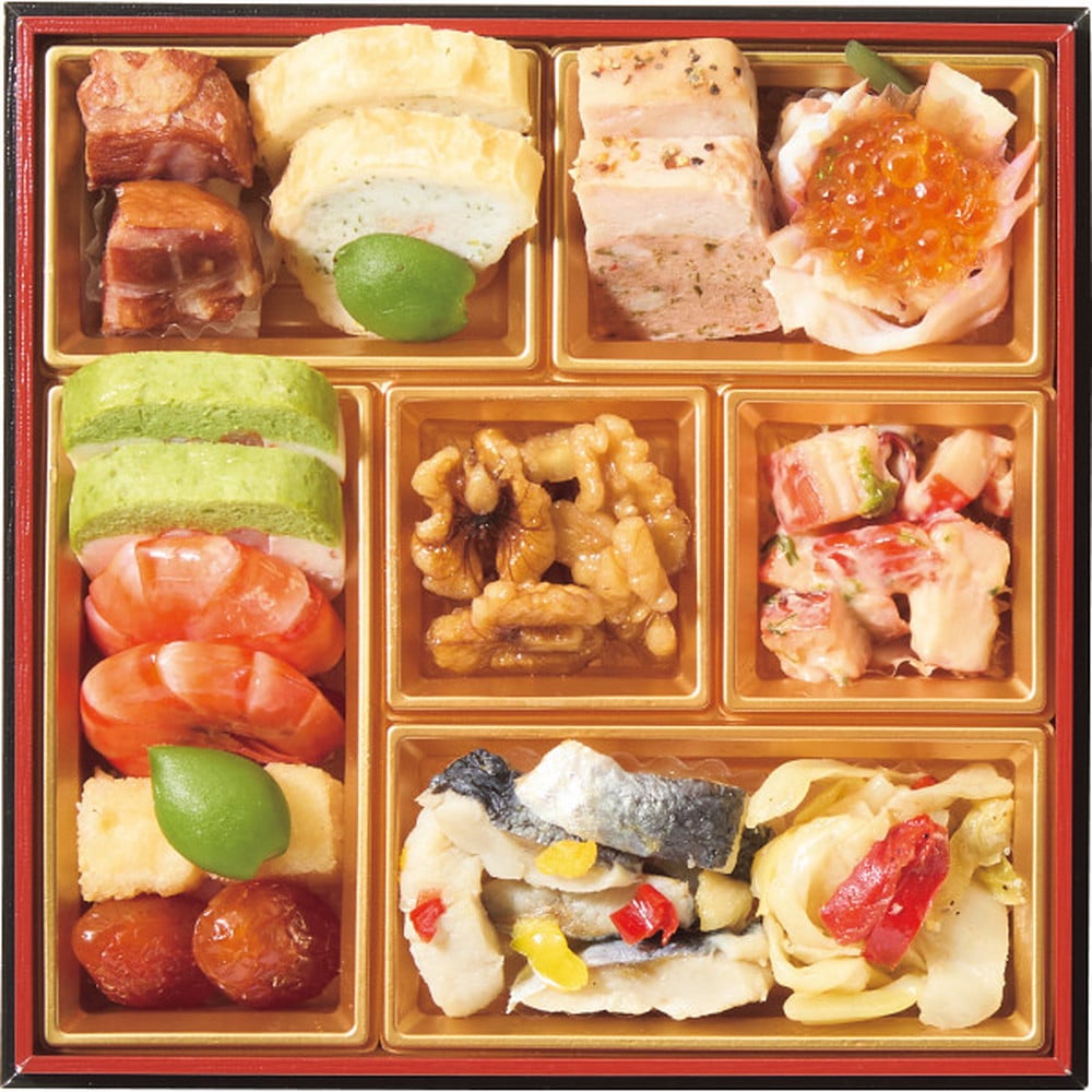 ●お重サイズ=約18×18×5.3(二段10.6)cm●重箱盛付済商品●特製紙重箱入[賞味期限:冷凍保存2026年2月28日/解凍後冷蔵保存2日間]※解凍方法:冷蔵庫/約24時間●<壱の重>17品目:笹巻みたらし餅、伊達巻、焼筍煮、椎茸煮、味付よもぎ麩、海老艶煮、鮭味噌焼、紅白蒲鉾、味付数の子、黒豆金箔のせ、栗きんとん、田作り、花こんにゃく赤、花こんにゃく白、叩き牛蒡、金柑蜜煮、松竹梅松葉、<弐の重>14品目:合鴨スモーク、カニとクリームソースのパイ包み、若桃甘露、エビとアスパラのテリーヌ、スモークシュリンプ、ポテトチーズ、ドライトマト赤ワイン煮、ホワイトパストラミ、いか梅酢、いくらしょうゆ漬、くるみ旨煮、いかスモークサラダ、にしんマリネ、アンチョビキャベツ●約2人前●31品●限定数230●温度帯:冷凍●商品お届け日:12月29日(月)