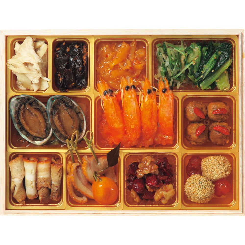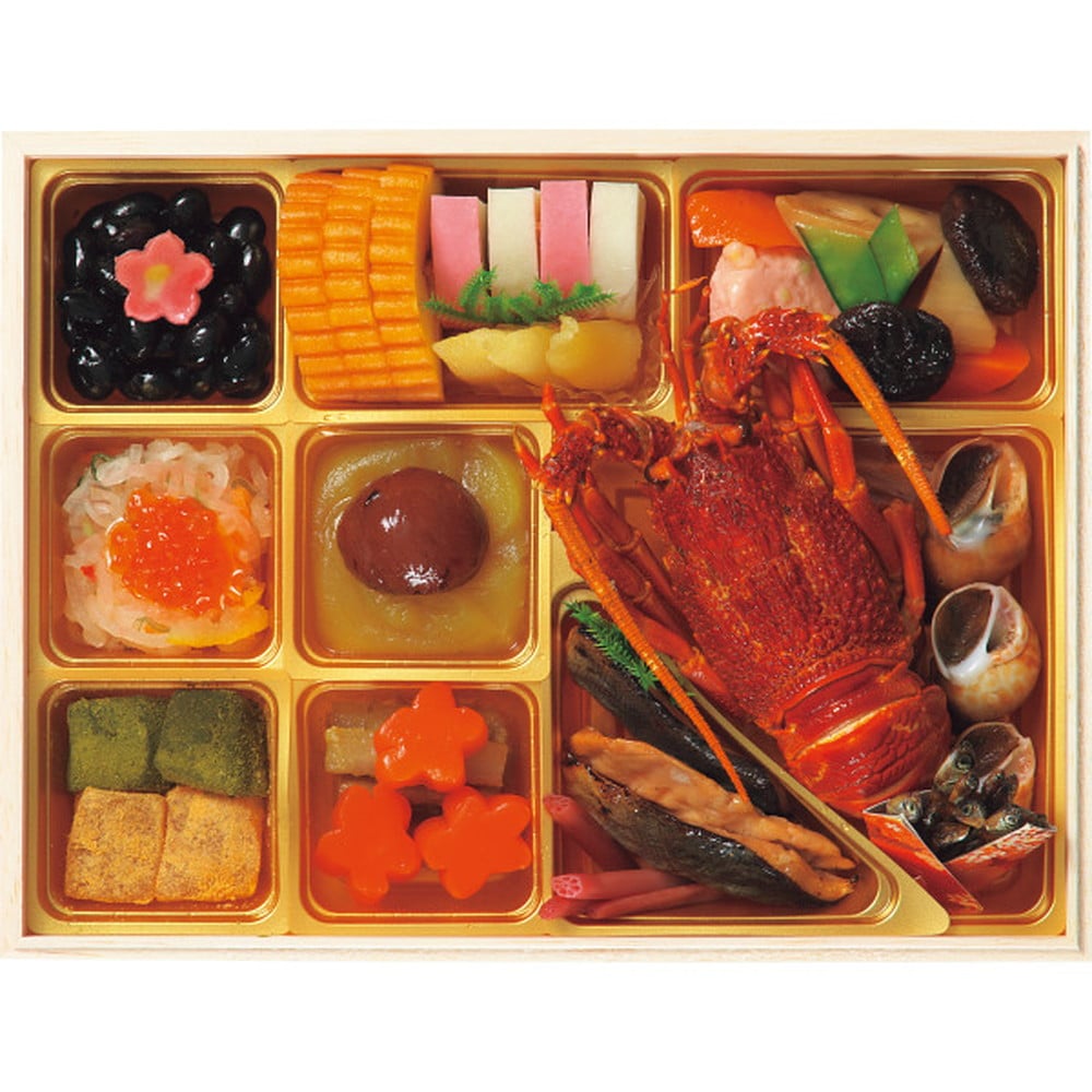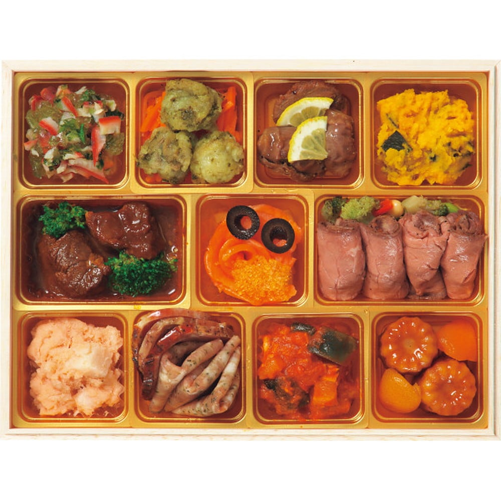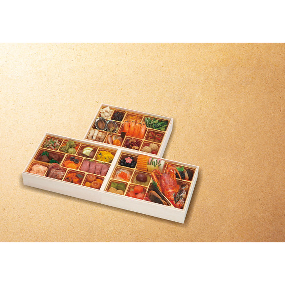 ●<壱の重>24品目:栗豆煮、生麩(梅)、彩り大根なます、いくら醤油漬、わらび餅風(きな粉)、わらび餅風(抹茶きなこ)、伊達巻、かまぼこ(紅)、かまぼこ(白)、味付け数の子、さつま芋きんとん、渋皮栗甘露煮、ごぼう西京漬、花形こんにゃく、人参旨煮、椎茸旨煮、蓮根旨煮、えびと枝豆しんじょ、きぬさや、ボイルロブスター、バイ貝旨煮、鮭幽庵焼、蓮の芽梅酢漬、のし田作り<弐の重>19品目:2種貝とあおさジュレ和え、帆立ムニエルバジルソース、キャロット・ラペ、砂肝焼レモンペッパー、スライスレモン、かぼちゃサラダ、ビーフシチュー、ボイルブロッコリー、トラウトサーモンロール、スライスブラックオリーブ、とびっこ黄金、黒仕込みローストビーフ、豆とブロッコリーのサラダ(ノンオイル青じそドレッシング)、里芋明太サラダ、黒糖ローストポーク、イタリアンソーセージ、蒸し鶏と野菜のトマトソース、カヌレ、杏子白ワイン煮<参の重>16品目:蒸し鶏ほぐし、ピリ辛きくらげラー油、味付け中華くらげ、ザーサイと水菜のサラダ、小松菜ナムル、活煮あわびオイスター煮、小松菜オイスターあん、有頭海老チリソース、黒酢肉団子、クコの実、他6品