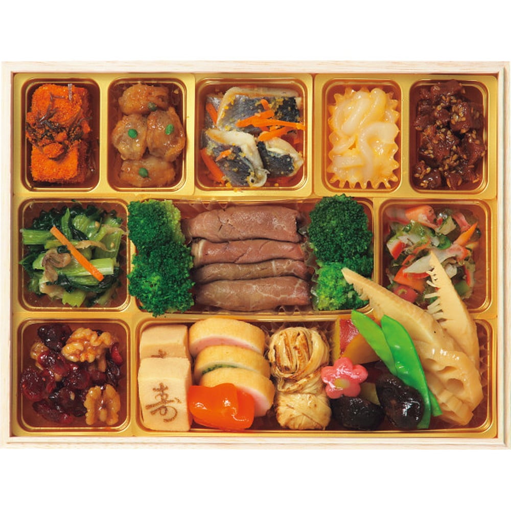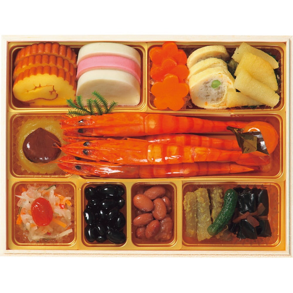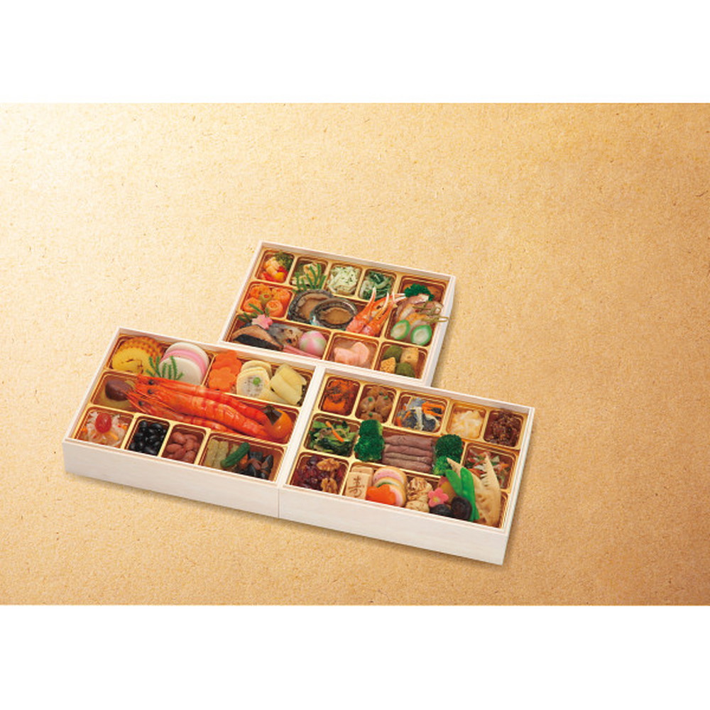●<壱の重>19品目:伊達巻、かまぼこ(白)、かまぼこ(紅)、きのこ湯葉和え、花形人参旨煮、笹がき信田、菜の花松前、味付け数の子、さつま芋きんとん、渋皮栗甘露煮、有頭姿海老旨煮、葉付金柑、彩り大根なます、ドライトマト赤ワイン煮、黒豆煮、金時豆、ごぼう西京漬、一口にしん昆布巻、きゅうり酢漬<弐の重>21品目:真鱈子旨煮、焼帆立照焼、にしん甘酢漬、いかうに和え、金胡麻鮪角煮、小松菜と舞茸の煮浸し、黒仕込みローストビーフ、ボイルブロッコリー、北寄貝とあおさジュレ和え、クランベリーくるみ飴炊き、寿高野豆腐、なごみ巻(えび)、なごみ巻(ほうれん草)、湯葉団子旨煮、紅あずまふっくら煮、厚切り筍旨煮、椎茸香煮、蓮根旨煮、花形こんにゃく、きぬさや、生麩(梅)<参の重>22品目:海老と野菜のマリネ、万願寺唐辛子お揚げ煮、蒸し鶏ほぐし(バジルソース)、ザーサイと水菜のサラダ、肉団子照焼、ボイルブロッコリー、トラウトサーモンロール、黄金とびっ子、スタッフドオリーブ、活あわび旨煮、釜揚げわかめ(青じそドレッシング)、ベニズワイかに爪肉、黒糖ローストポーク、合鴨ローススライス、若桃甘露煮、生麩(桜)、他7品