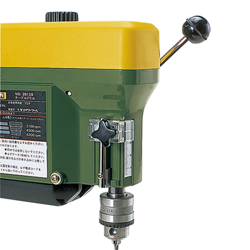 卓上で簡単に穴開け作業が可能です。 穴開け加工。 精密な穴開け加工ができる卓上小型テーブルドリルです。 ●電源:100V・50/60Hz。 ●消費電力:80W。 ●ドリル取り付け可能サイズ:径0.8~6.0mm。 ●スピンドル上下:30mm。 ●回転数:2100・4500・6200min-1(回/分)・3段ベルト変速。 ●テーブルサイズ:120×225mm・本体高さ:350mm。 ●定格使用時間:15分。 ●重量:4.0kg。 ●セット内容:L型レンチ・チャックキー・平行ガイド。