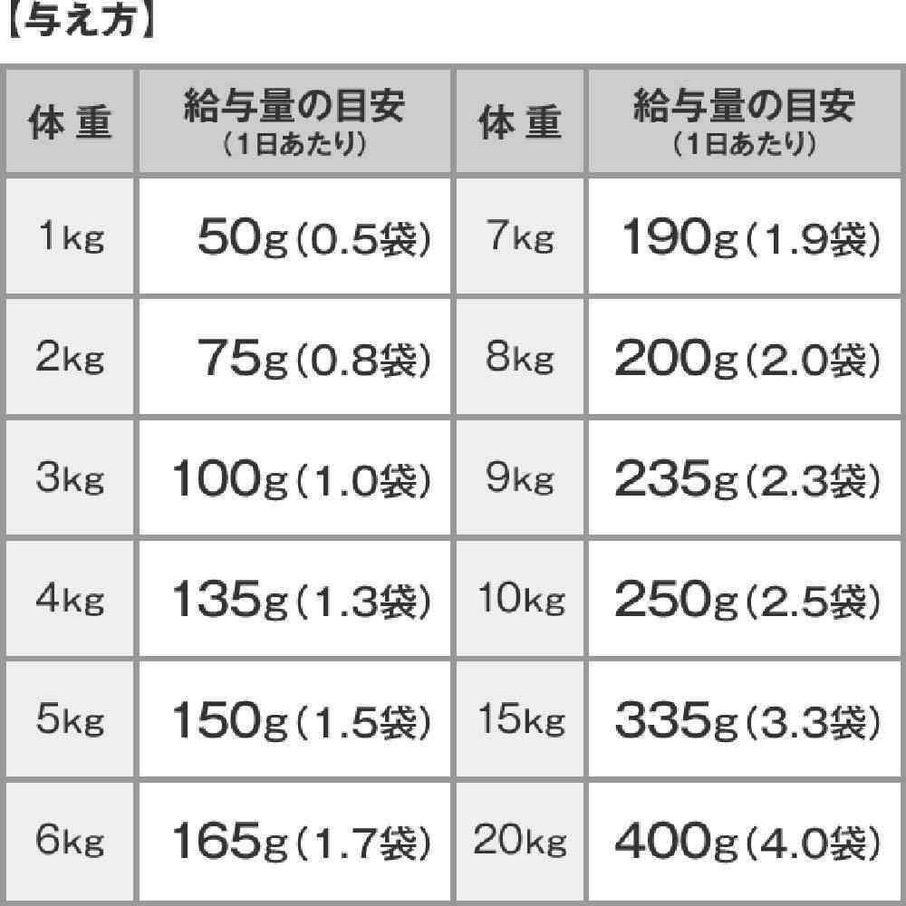 体重によって与える量が異なります。 過剰に給与することはさけ、1日の目安量を守ってください。 体重/給与量の目安(1日あたり) 1kg・・・・・・・50g(0.5袋) 2kg・・・・・・・75g(0.8袋) 3kg・・・・・・・100g(1.0袋) 4kg・・・・・・・135g(1.3袋) 5kg・・・・・・・150g(1.5袋) 6kg・・・・・・・165g(1.7袋) 7kg・・・・・・・190g(1.9袋) 8kg・・・・・・・200g(2.0袋) 9kg・・・・・・・235g(2.3袋) 10kg・・・・・・・250g(2.5袋) 15kg・・・・・・・335g(3.3袋) 20kg・・・・・・・400g(4.0袋) 健康状態、年齢、運動量を考慮した上で上記の給与量を目安に1日数回に分けて与えてください。 別の容器に新鮮な水をたっぷり用意して与えてください。 初めて与える場合は、一度に大量に食べさせると便がゆるくなることがあるため、今までの食事に少量混ぜて、少しずつ量を増やしながら1~2週間で切り替えてください。