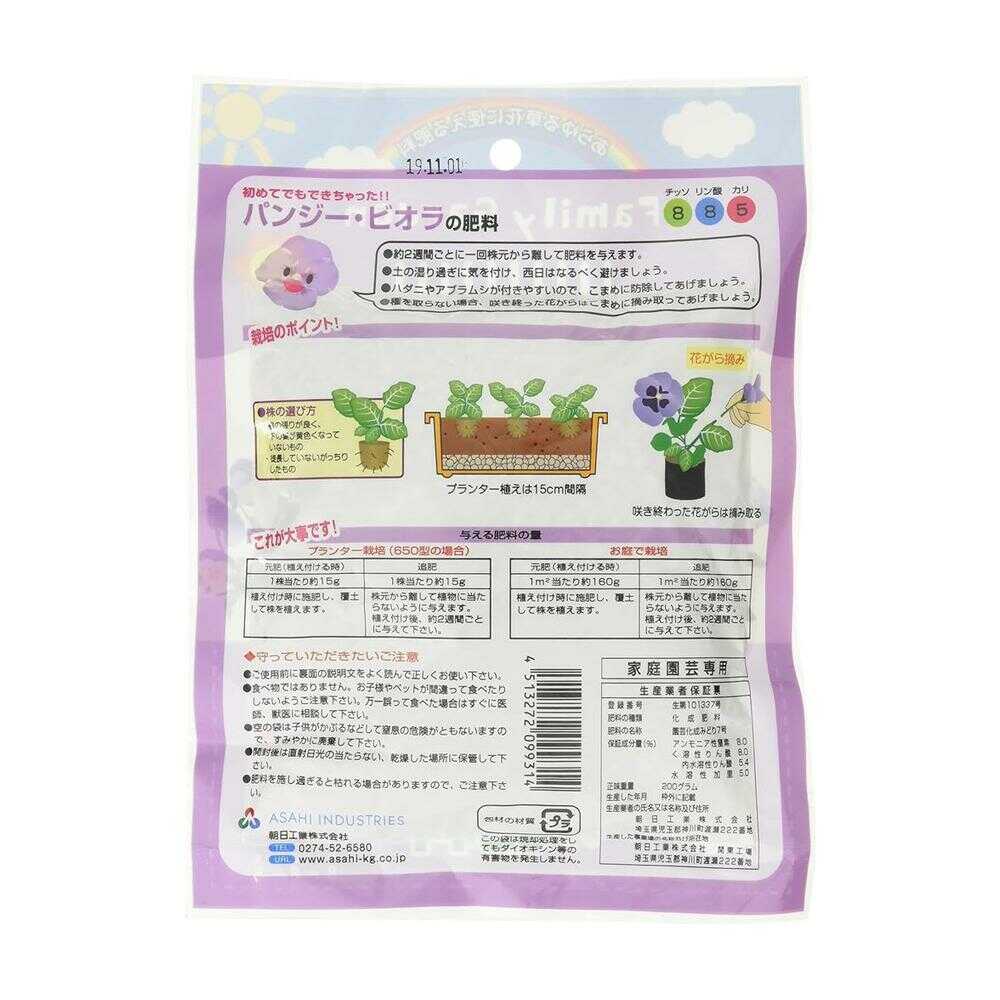 お庭をきれいに賑わす、パンジーとビオラの専用肥料です 花付きを良くするリン酸成分入り肥料です。 プランターにまく場合、軽く一握り(約20g)