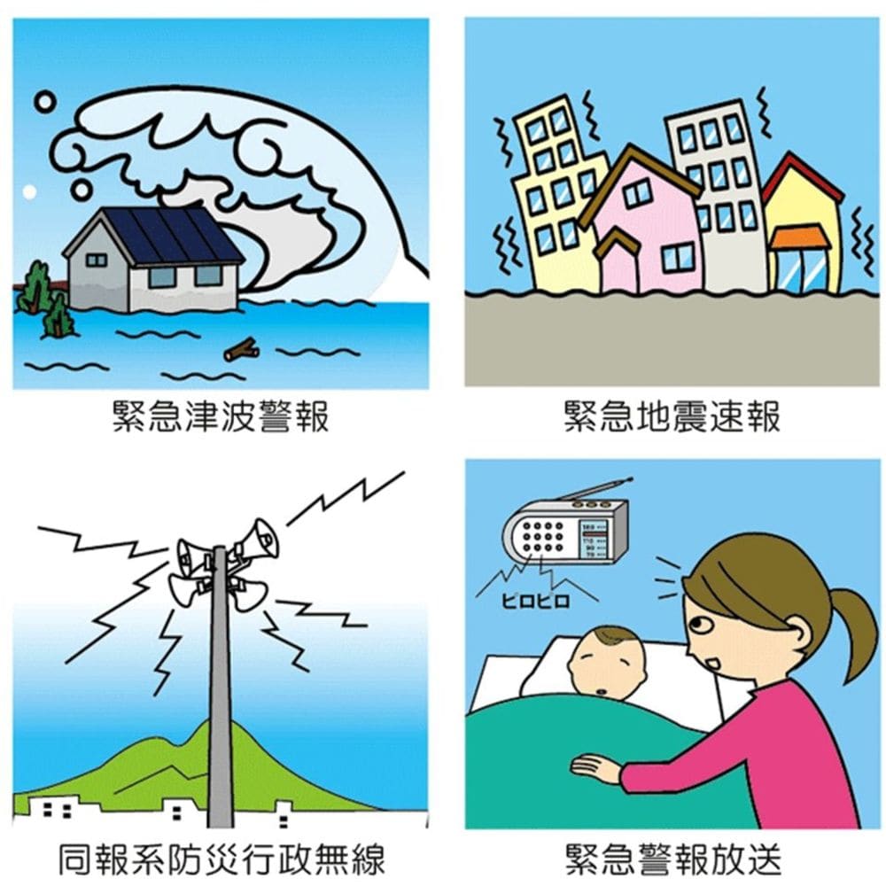 ●FMラジオを受信中でも、同報系防災行政無線(アナログ)や緊急警報放送等の監視をしていますので、これらを受信した場合は自動的に緊急放送へ切り替わります。●また、本機はNHK-FM局から放送される緊急地震速報を検出してラジオを起動する仕組みになっています。●NHK-FM放送は全国放送であるため、地域の設定に関係なく緊急地震速報を受信します