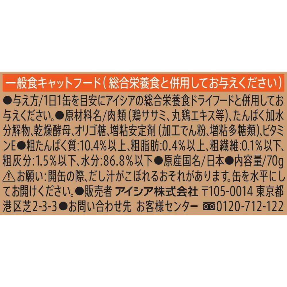 ●開缶時や開缶後に手を切らないようご注意ください ●1日1缶を目安に、アイシアの総合栄養食ドライフードと併用してお与えください。