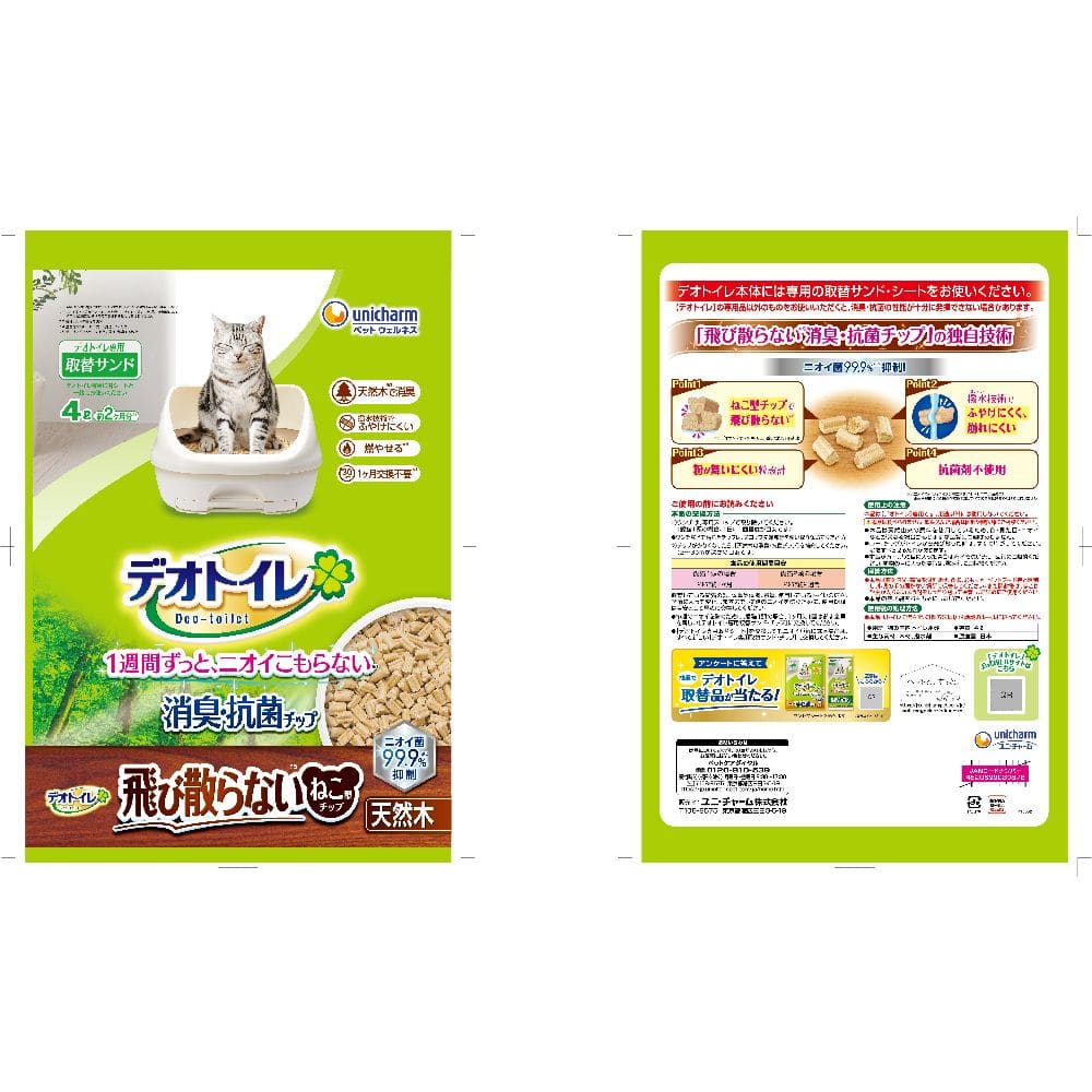 本品の交換方法1.ウンチは、専用スコップで取り除いてください。(愛猫1頭の場合、1日に1回程度が目安です)●ウンチなどで汚れたチップは、スコップ先端部分を使い取り除いてください。2.チップが少なくなったら、【天然木の消臭・抗菌チップ】を補充してください。(2~3cmが深さの目安です)飼育している愛猫の数、体重や体調、尿量、使用しているトイレの広さ、季節によって変化しますので、排泄のニオイを防ぐために、使用期間は目安として早めに交換してください。●排泄のニオイを防ぐために、愛猫1頭の場合、1ヶ月に1回は必ず全量を新しい【デオトイレ専用取替サンド・チップ】に交換してください。●【デオトイレ専用取替シート】を交換してもニオイが気になる場合は、すべて新しい【デオトイレ専用取替サンド・チップ】に交換してください。