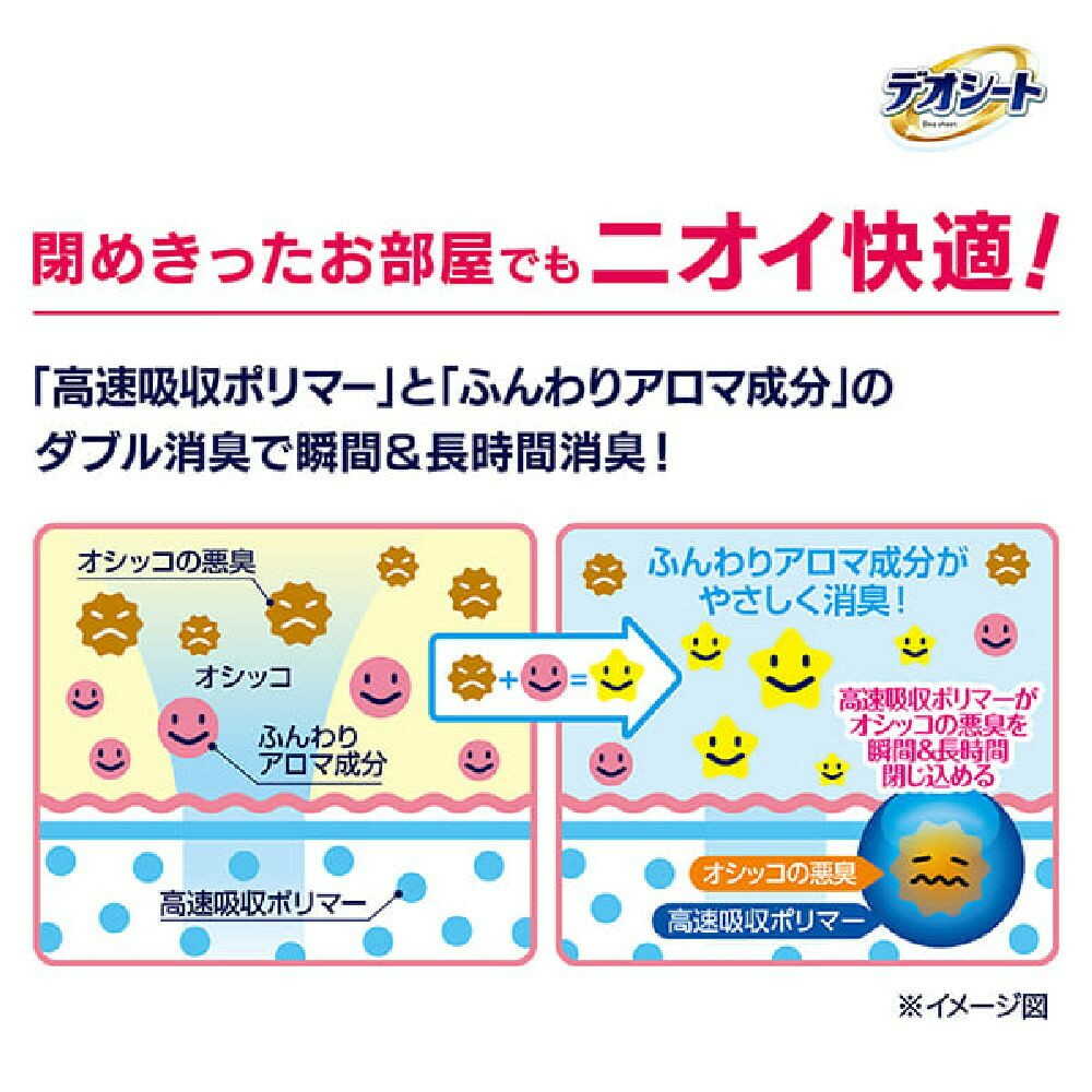 「高速吸収ポリマー」と「ふんわりアロマ成分」のダブル消臭で瞬間&長時間消臭! 天然の植物成分を配合した安心感・清潔感ある香り。 清潔感のあるナチュラルピンクのシートとふわさら吸収シートでオシッコの見た目も清潔!