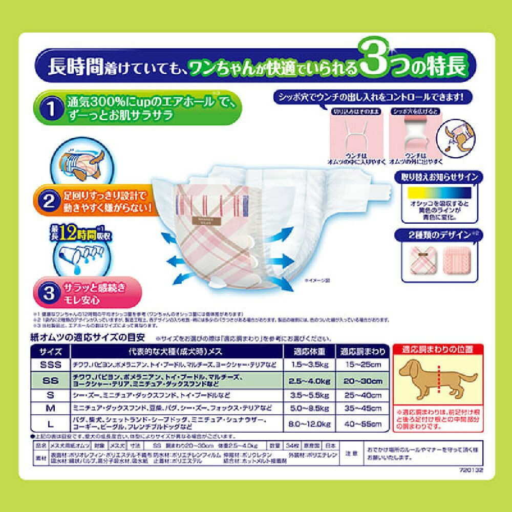 ●本品は取り出し時に製品同士がくっついて出てくる場合がありますが、品質上問題はございませんので、安心してご使用いただけます。 ●本品は使い捨ての紙オムツですので、洗濯しないでください。 ●万が一、製品の中身が人の目に入った場合は流水で洗い流し、医師にご相談ください。動物の目に入った場合は、獣医師にご相談ください。 ●本品は切って使用すると、中身が飛び散ったり、汚れやモレの原因となる為、そのままで使用してください。 ●本品は食べられないので、飲み込まないでください。 ●万が一、飲み込んだり吸い込んだりした場合は、医師や獣医師にご相談ください。 ●テープは皮膚・被毛につけないでください。 ●皮膚トラブルがあった場合はご使用をお控えください。 ※本品は愛犬の体調や尿量、使用環境によっては機能が十分に発揮できない場合があります。 【!】テープは背中側で留めてください。お腹側でテープを留めるとテープ周辺は吸収体がないので、オシッコがモレることがあります。